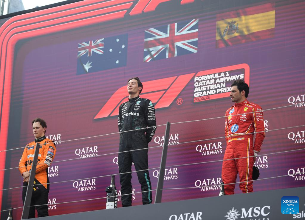 SPIELBERG, 1 julio, 2024 (Xinhua) -- Imagen del 30 de junio de 2024 del piloto australiano de la escudería McLaren, Oscar Piastri (i), ganador del segundo lugar, el piloto británico de la escudería Mercedes, George Russell (c), ganador del primer lugar y el piloto español de la escudería Ferrari, Carlos Sainz, ganador del tercer lugar, asistiendo a la ceremonia de premiación de la carrera del Gran Premio de Austria de Fórmula 1, en Spielberg, Austria. (Xinhua/He Canling)
