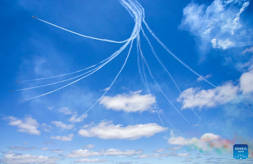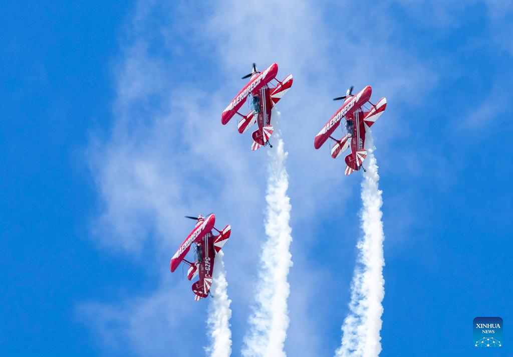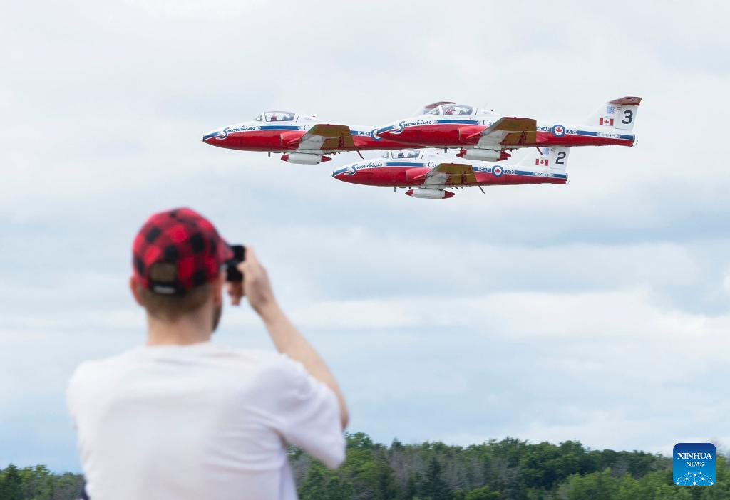 QUINTE WEST, 1 julio, 2024 (Xinhua) -- Imagen del 30 de junio de 2024 del equipo acrobático canadiense "Northern Stars" realizando una presentación durante el Espectáculo Aéreo Internacional Quinte 2024, en Quinte West, Ontario, Canadá. (Xinhua/Zou Zheng)