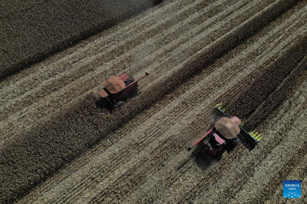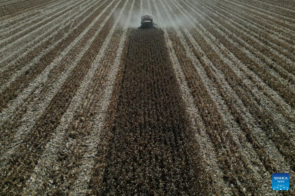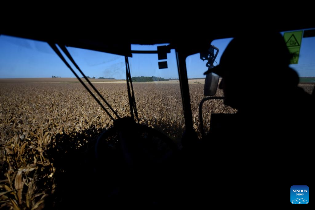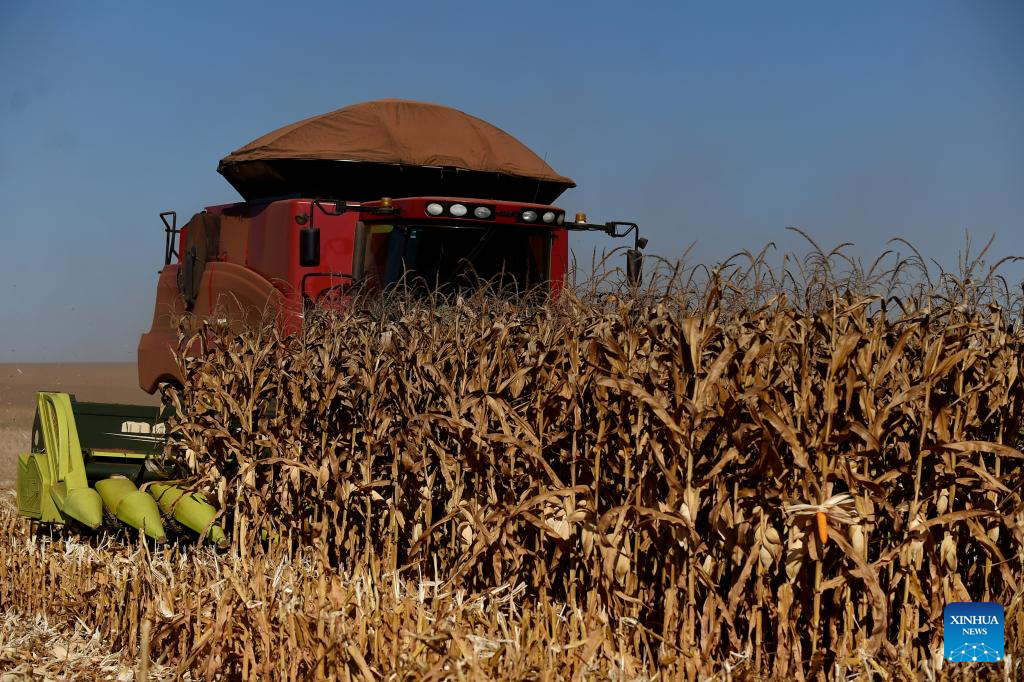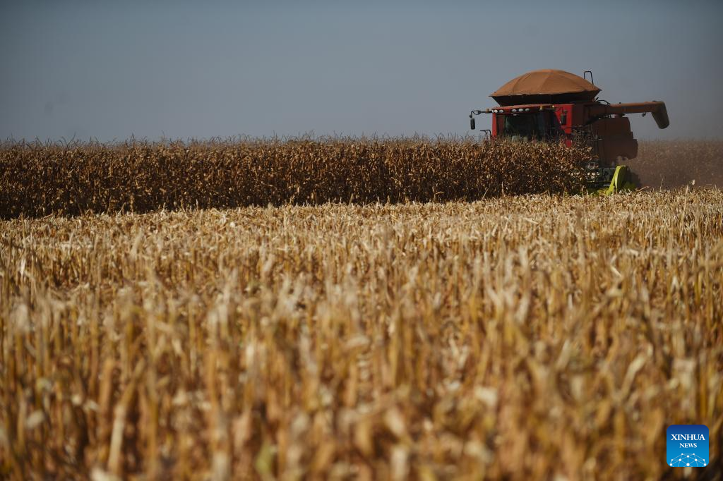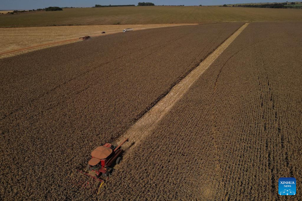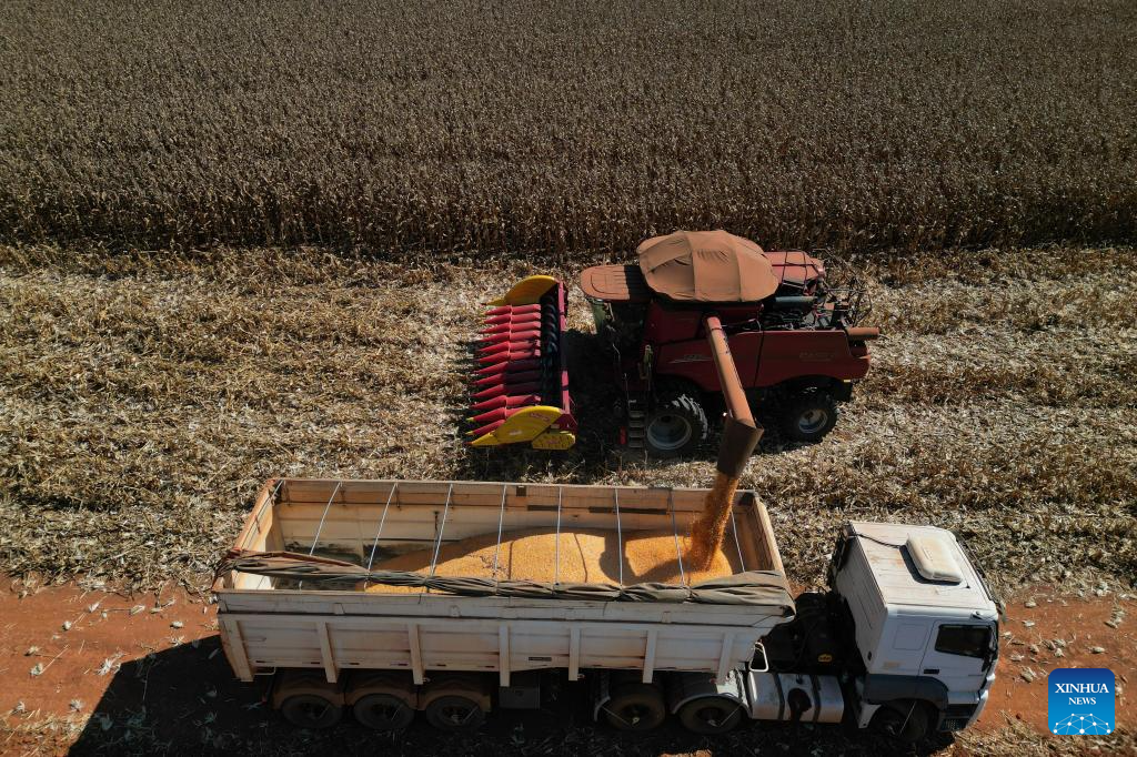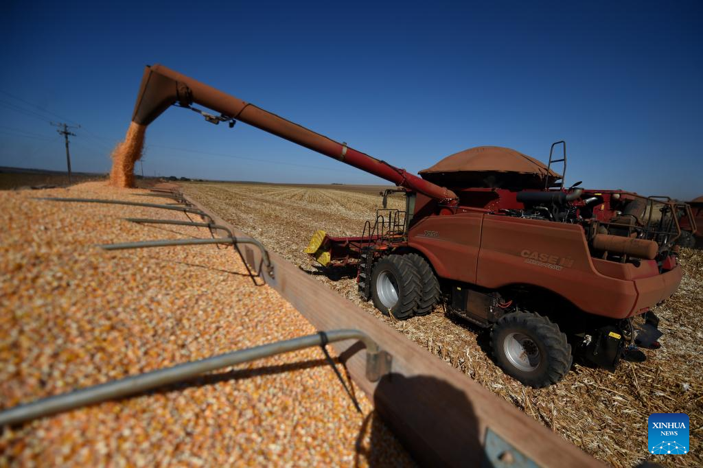 BRASILIA, 2 julio, 2024 (Xinhua) -- Una máquina agrícola cosecha maíz en la granja Nativa, en el Núcleo Rural Buriti Vermelho, en Brasilia, Brasil, el 2 de julio de 2024. (Xinhua/Lucio Tavora)