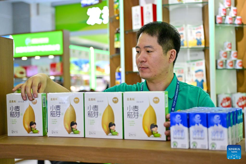 URUMQI, 1 julio, 2024 (Xinhua) -- Imagen del 26 de junio de 2024 de un empleado acomodando productos de germen de trigo en la VIII Exposición China-Eurasia, en Urumqi, en la región autónoma uygur de Xinjiang, en el noroeste de China. Con el tema "Nuevas oportunidades de la Ruta de la Seda, Nueva Vitalidad para la Cooperación Euroasiática", la exposición de cinco días que abrió el 26 de junio ha atraído a 1.900 participantes de 50 países, regiones y organizaciones internacionales, mostrando más de 6.000 variedades de productos. (Xinhua/Ding Lei)
