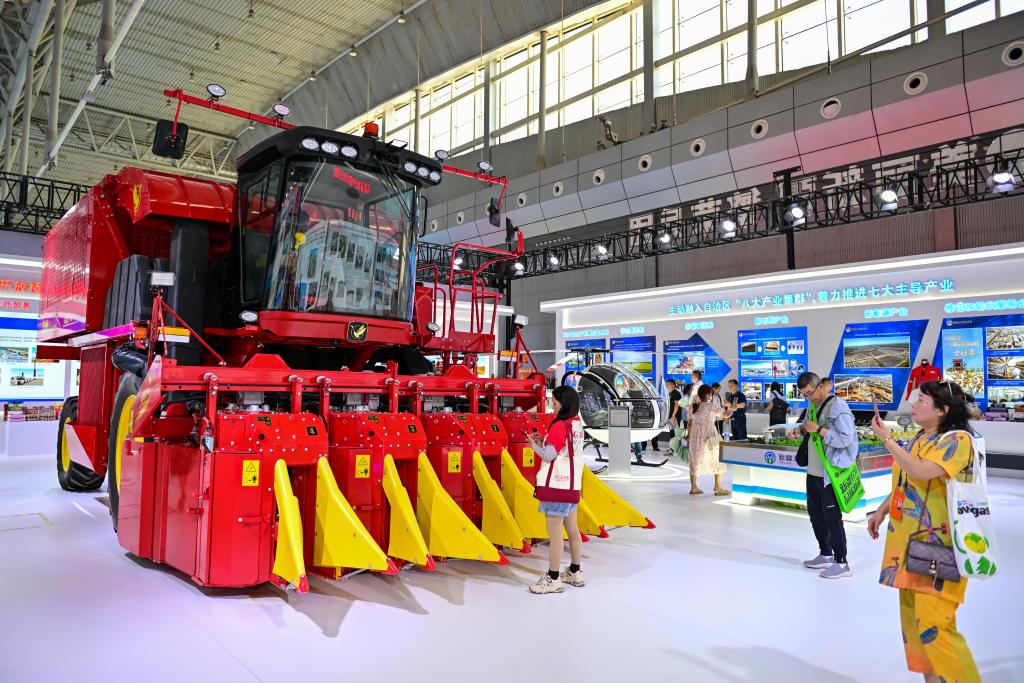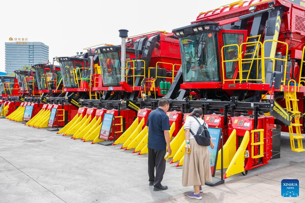 URUMQI, 1 julio, 2024 (Xinhua) -- Imagen del 30 de junio de 2024 de visitantes observando recolectoras de algodón exhibidas en la VIII Exposición China-Eurasia, en Urumqi, en la región autónoma uygur de Xinjiang, en el noroeste de China. Con el tema "Nuevas oportunidades de la Ruta de la Seda, Nueva Vitalidad para la Cooperación Euroasiática", la exposición de cinco días que abrió el 26 de junio ha atraído a 1.900 participantes de 50 países, regiones y organizaciones internacionales, mostrando más de 6.000 variedades de productos. (Xinhua/Chen Shuo)