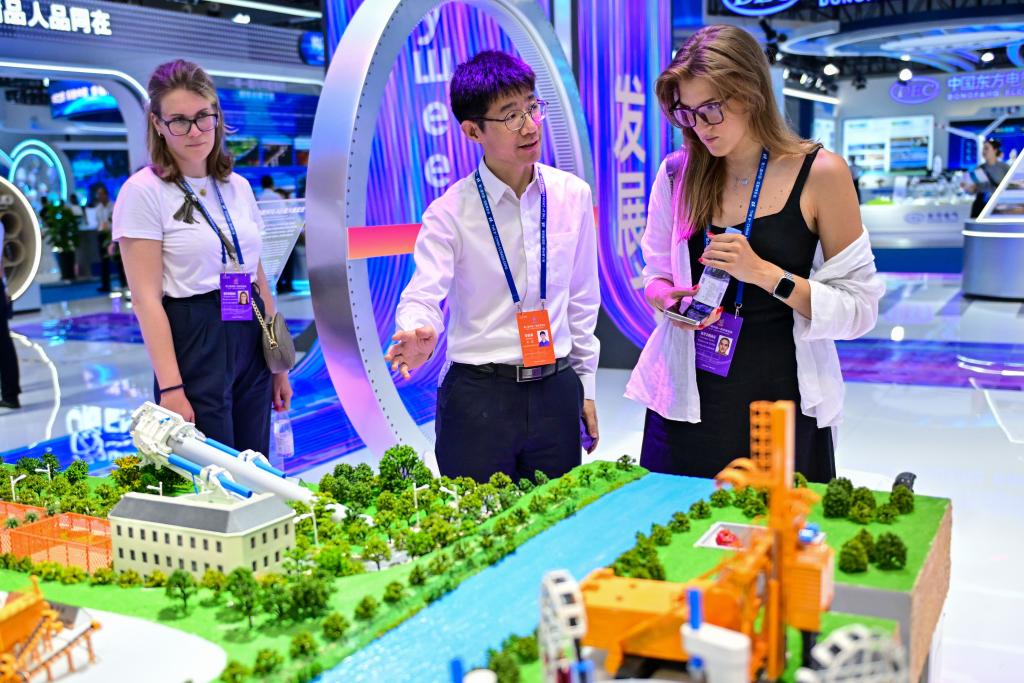 URUMQI, 1 julio, 2024 (Xinhua) -- Imagen del 26 de junio de 2024 de clientes extranjeros visitando el estand de CRCC en la VIII Exposición China-Eurasia, en Urumqi, en la región autónoma uygur de Xinjiang, en el noroeste de China. En su octava edición, esta exposición es aclamada como un canal importante para la cooperación económica y comercial entre China y los países euroasiáticos. (Xinhua/Ding Lei)