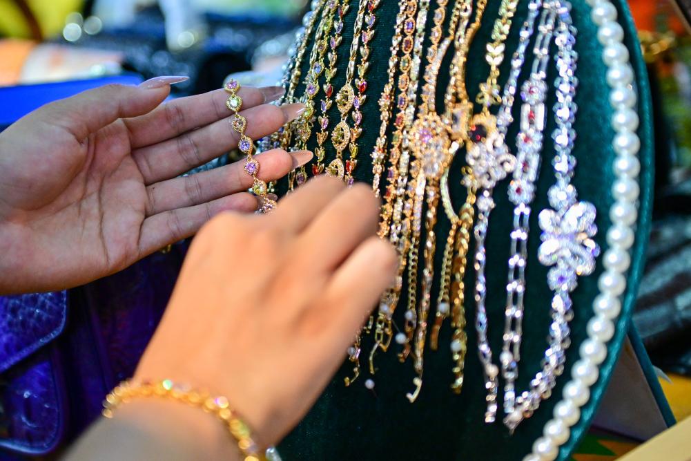 URUMQI, 1 julio, 2024 (Xinhua) -- Imagen del 27 de junio de 2024 de un visitante seleccionando brazaletes en el estand de Ghana en la VIII Exposición China-Eurasia, en Urumqi, en la región autónoma uygur de Xinjiang, en el noroeste de China. En su octava edición, esta exposición es aclamada como un canal importante para la cooperación económica y comercial entre China y los países euroasiáticos. (Xinhua/Ding Lei)