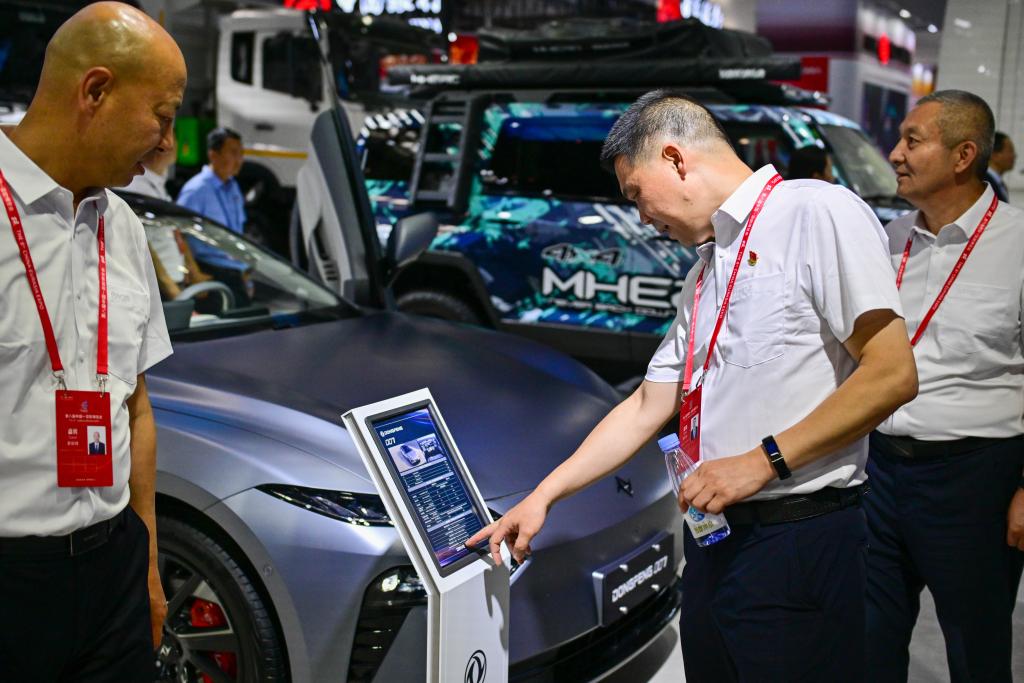 URUMQI, 1 julio, 2024 (Xinhua) -- Imagen del 26 de junio de 2024 de personas visitando el estand de Dongfeng Motor Corporation en la VIII Exposición China-Eurasia, en Urumqi, en la región autónoma uygur de Xinjiang, en el noroeste de China. En su octava edición, esta exposición es aclamada como un canal importante para la cooperación económica y comercial entre China y los países euroasiáticos. (Xinhua/Ding Lei)