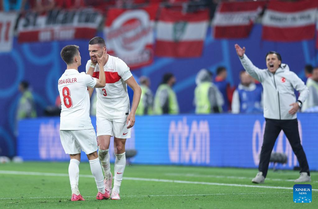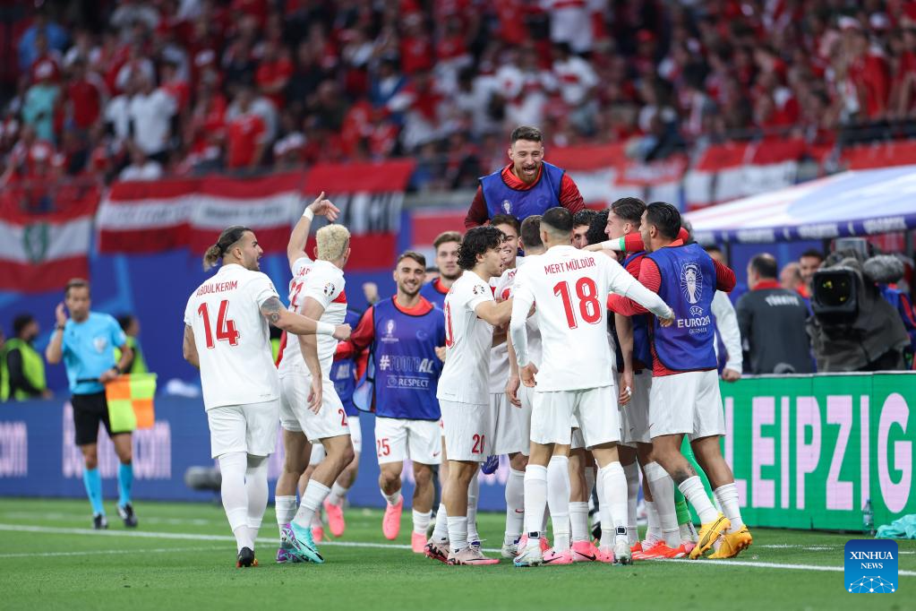 LEIPZIG, 3 julio, 2024 (Xinhua) -- Imagen del 2 de julio de 2024 de jugadores de Turquía festejando una anotación de Merih Demiral durante el partido correspondiente a los octavos de final de la EURO 2024 de la UEFA, entre Turquía y Austria, en Leipzig, Alemania. (Xinhua/Bai Xuefei)