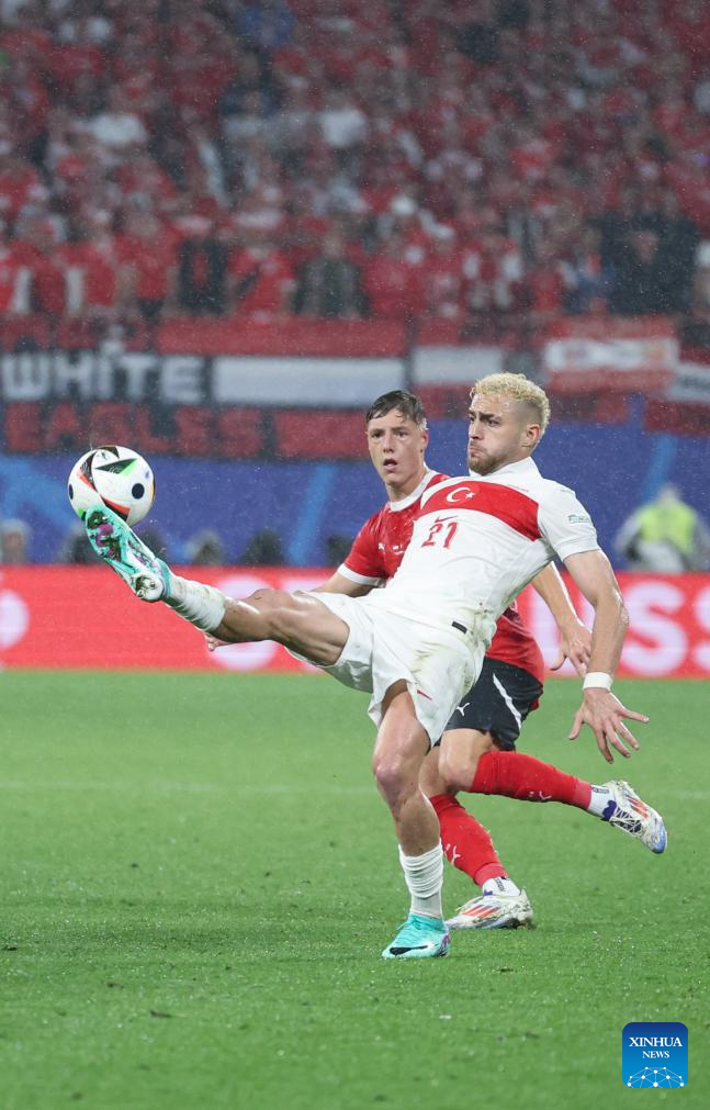 LEIPZIG, 3 julio, 2024 (Xinhua) -- Imagen del 2 de julio de 2024 de Baris Alper Yilmaz (frente), de Turquía, compitiendo con Alexander Prass, de Austria, durante el partido correspondiente a los octavos de final de la EURO 2024 de la UEFA, entre Turquía y Austria, en Leipzig, Alemania. (Xinhua/Bai Xuefei)