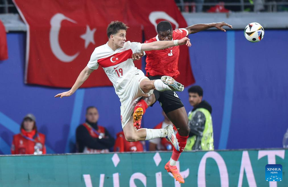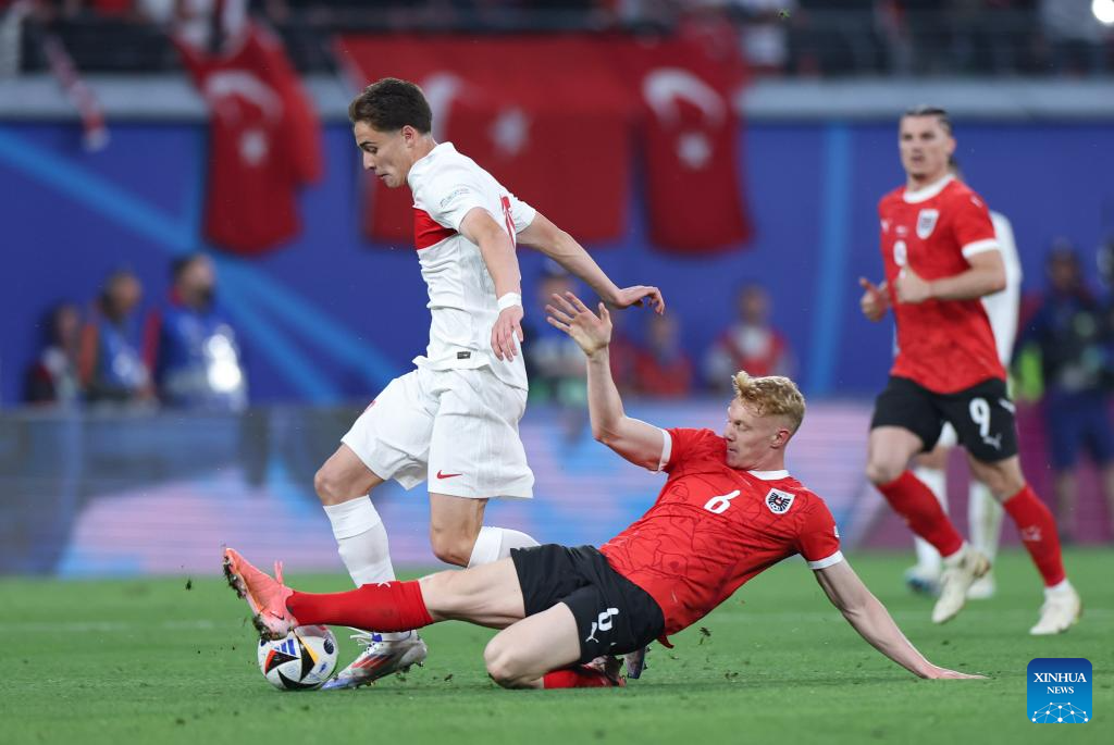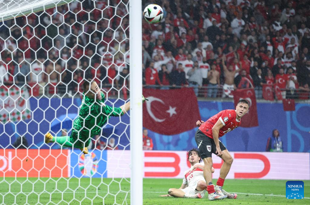 LEIPZIG, 3 julio, 2024 (Xinhua) -- Imagen del 2 de julio de 2024 de Christoph Baumgartner (d), de Austria, disparando durante el partido correspondiente a los octavos de final de la EURO 2024 de la UEFA, entre Turquía y Austria, en Leipzig, Alemania. (Xinhua/Bai Xuefei)