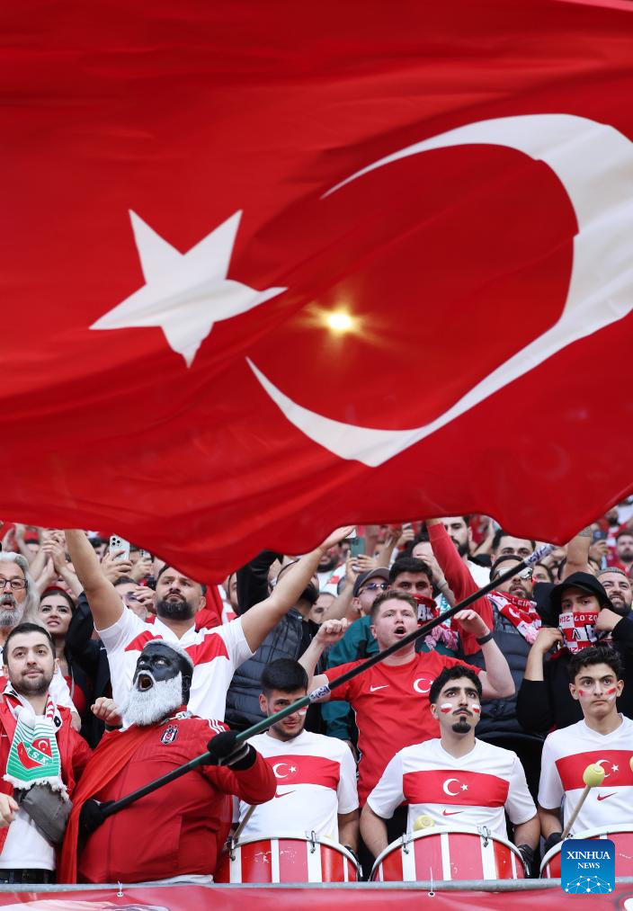 LEIPZIG, 3 julio, 2024 (Xinhua) -- Imagen del 2 de julio de 2024 de aficionados de Turquía animando a su equipo durante el partido correspondiente a los octavos de final de la EURO 2024 de la UEFA, entre Turquía y Austria, en Leipzig, Alemania. (Xinhua/Bai Xuefei)