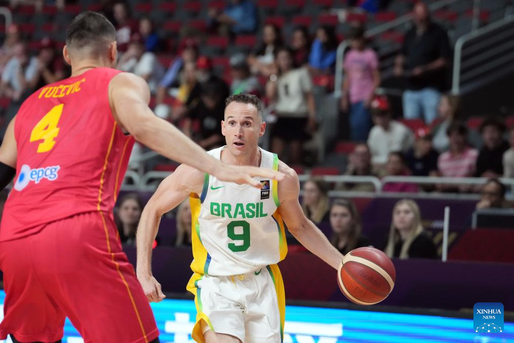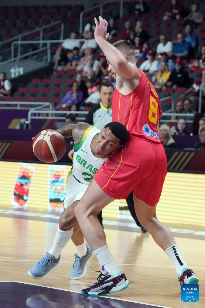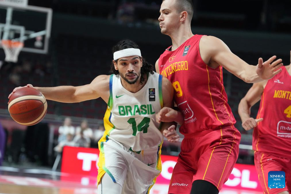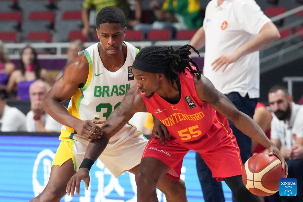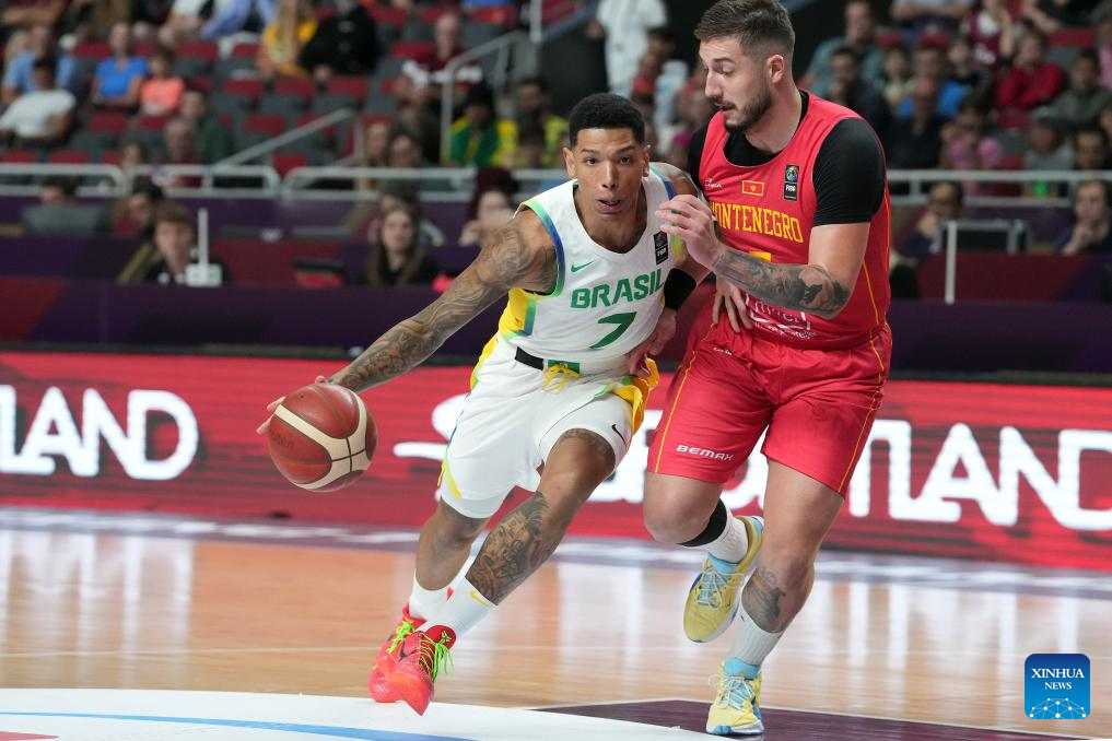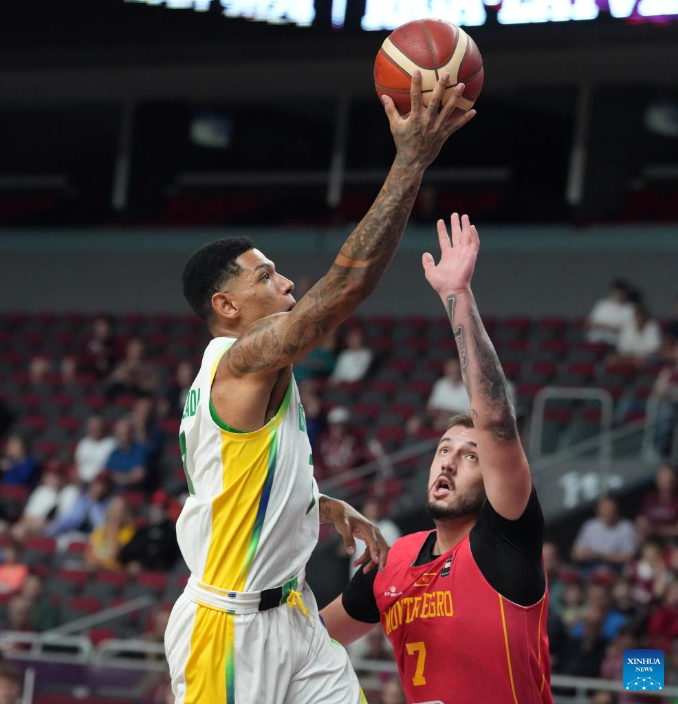 RIGA, 3 julio, 2024 (Xinhua) -- Imagen del 2 de julio de 2024 de Didi Louzada (i), de Brasil, compitiendo con Andrija Slavkovic, de Montenegro, durante el partido correspondiente al Grupo B del Torneo Masculino de Clasificación Olímpica FIBA 2024, entre Brasil y Montenegro, en Riga, Letonia. (Xinhua/Edijs Palens)