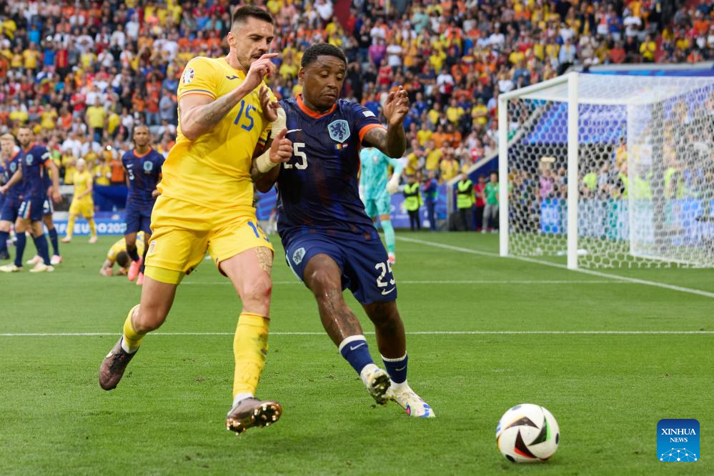 MUNICH, 3 julio, 2024 (Xinhua) -- Imagen del 2 de julio de 2024 de Steven Bergwijn (d), de Países Bajos, disputando el balón con Andonie Andrei Burca, de Rumania, durante el partido correspondiente a los octavos de final de la EURO 2024 de la UEFA, entre Rumania y Países Bajos, en Múnich, Alemania. (Xinhua/Meng Dingbo)