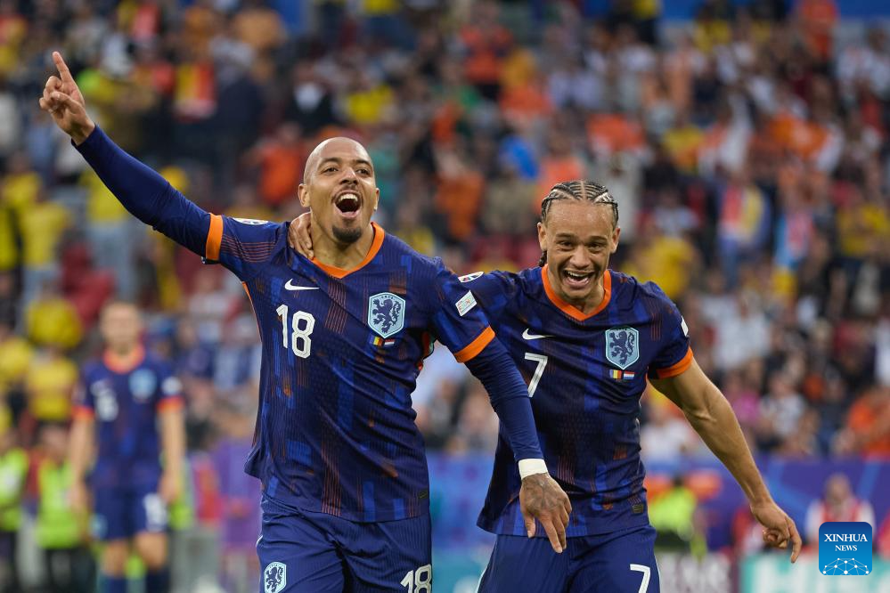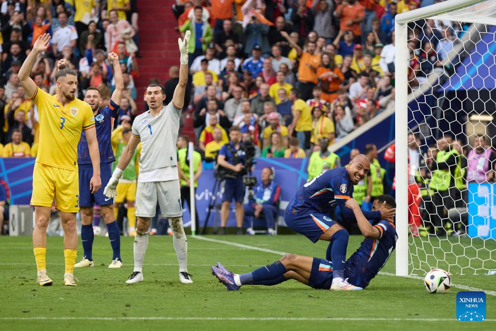 MUNICH, 3 julio, 2024 (Xinhua) -- Imagen del 2 de julio de 2024 de Cody Gakpo (d), de Países Bajos, festejando su anotación antes de su anulación por fuera de juego durante el partido correspondiente a los octavos de final de la EURO 2024 de la UEFA, entre Rumania y Países Bajos, en Múnich, Alemania. (Xinhua/Meng Dingbo)
