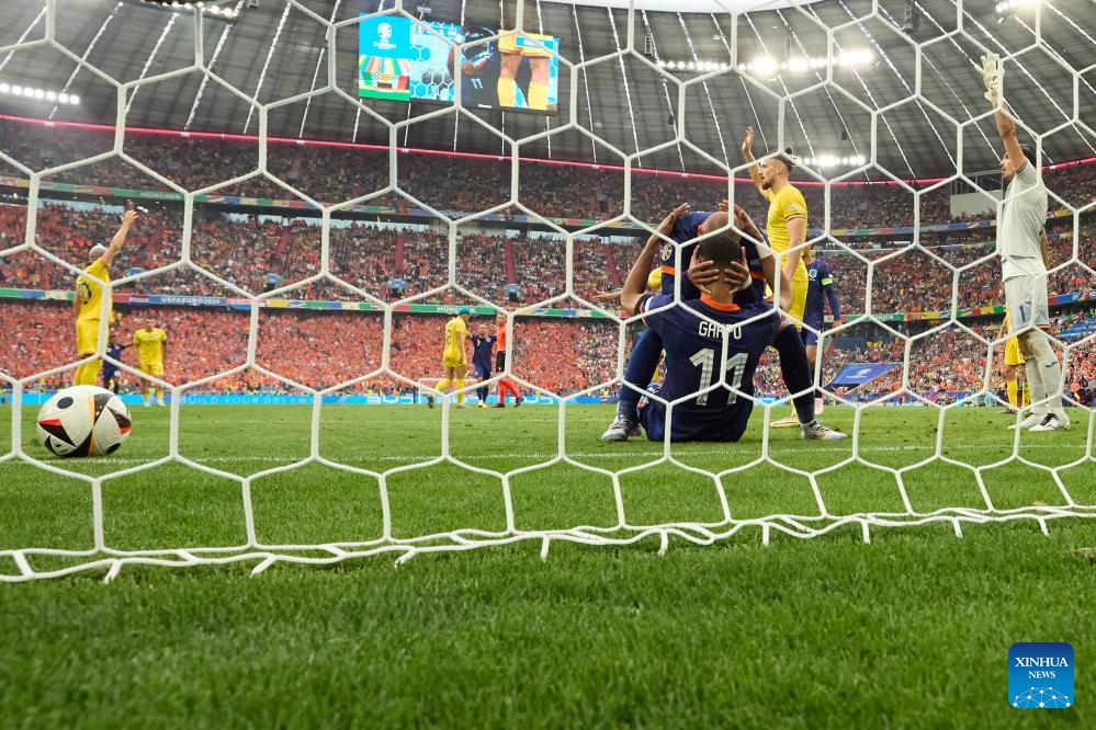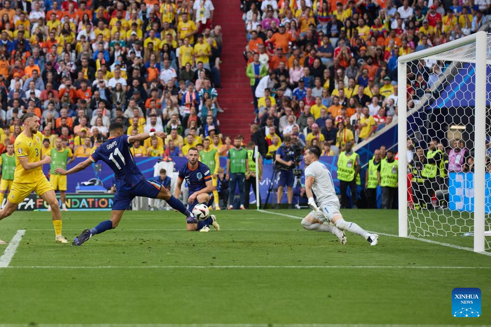 MUNICH, 3 julio, 2024 (Xinhua) -- Imagen del 2 de julio de 2024 de Cody Gakpo (2-i), de Países Bajos, disparando y anotando antes de su anulación por fuera de juego durante el partido correspondiente a los octavos de final de la EURO 2024 de la UEFA, entre Rumania y Países Bajos, en Múnich, Alemania. (Xinhua/Meng Dingbo)