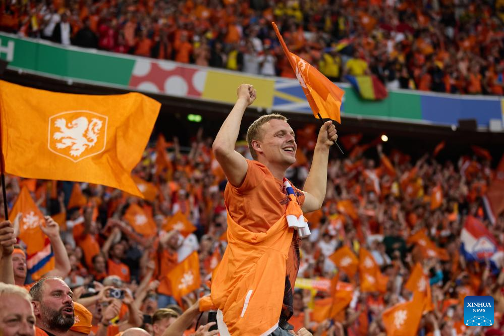 MUNICH, 3 julio, 2024 (Xinhua) -- Imagen del 2 de julio de 2024 de un aficionado de Países Bajos festejando al término del partido correspondiente a los octavos de final de la EURO 2024 de la UEFA, entre Rumania y Países Bajos, en Múnich, Alemania. (Xinhua/Meng Dingbo)