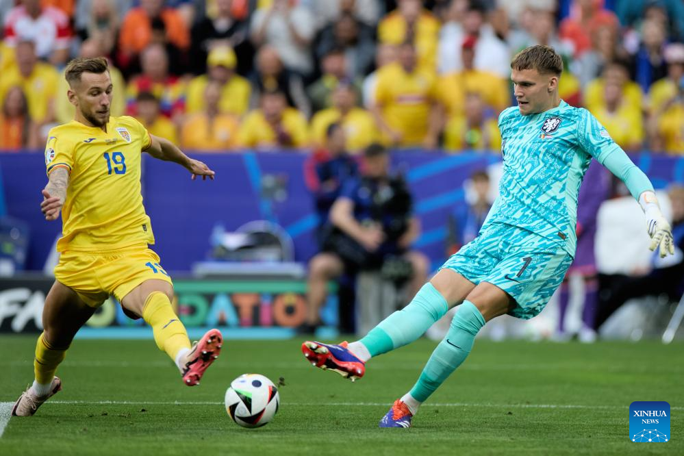MUNICH, 3 julio, 2024 (Xinhua) -- Imagen del 2 de julio de 2024 del guardameta Bart Verbruggen (d), de Países Bajos, disputando el balón con Denis-Mihai Dragus, de Rumania, durante el partido correspondiente a los octavos de final de la EURO 2024 de la UEFA, entre Rumania y Países Bajos, en Múnich, Alemania. (Xinhua/Meng Dingbo)
