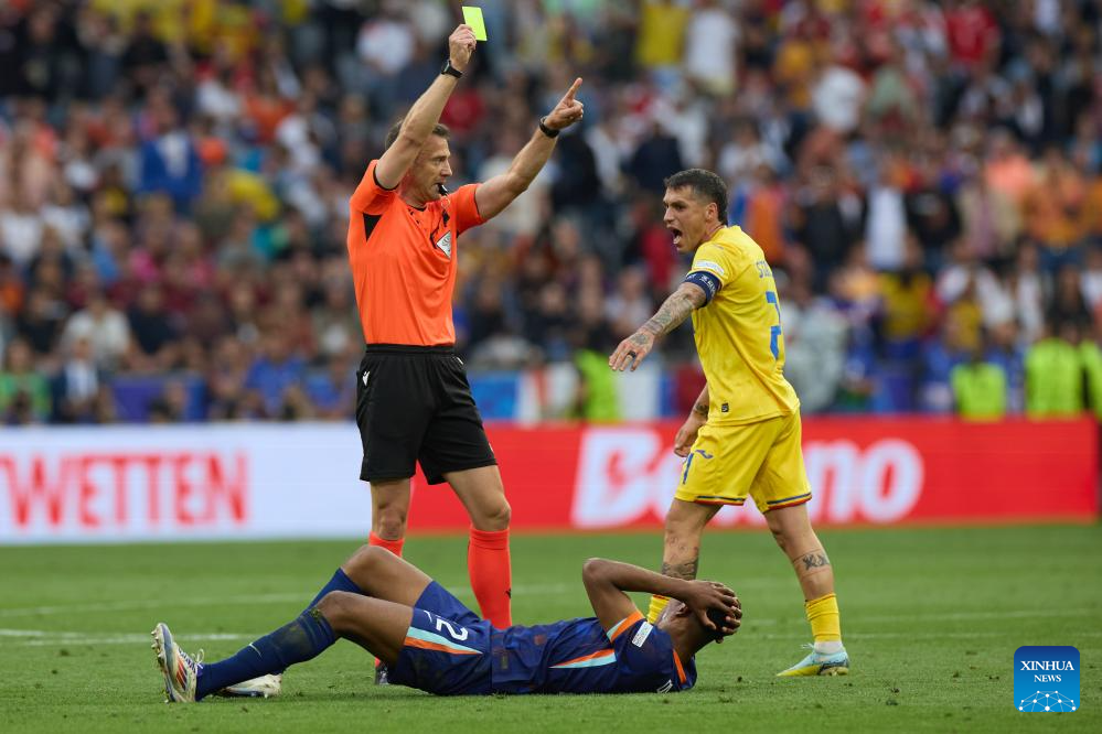 MUNICH, 3 julio, 2024 (Xinhua) -- Imagen del 2 de julio de 2024 del árbitro Felix Zwayer (i), mostrando una tarjeta amarilla a Nicolae Claudiu Stanciu (d), de Rumania, durante el partido correspondiente a los octavos de final de la EURO 2024 de la UEFA, entre Rumania y Países Bajos, en Múnich, Alemania. (Xinhua/Meng Dingbo)