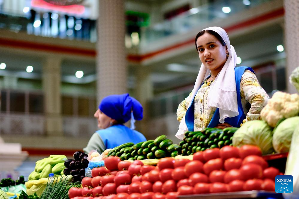 DUSAMBE, 4 julio, 2024 (Xinhua) -- Imagen del 13 de junio de 2024 de vendedoras vistas en un gran bazar, en Dusambé, Tayikistán. El gran bazar es una cautivadora atracción comercial en Dusambé, con una arquitectura distintiva y una maravillosa variedad de productos. (Xinhua/Zheng Kaijun)