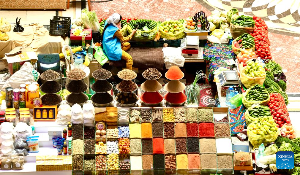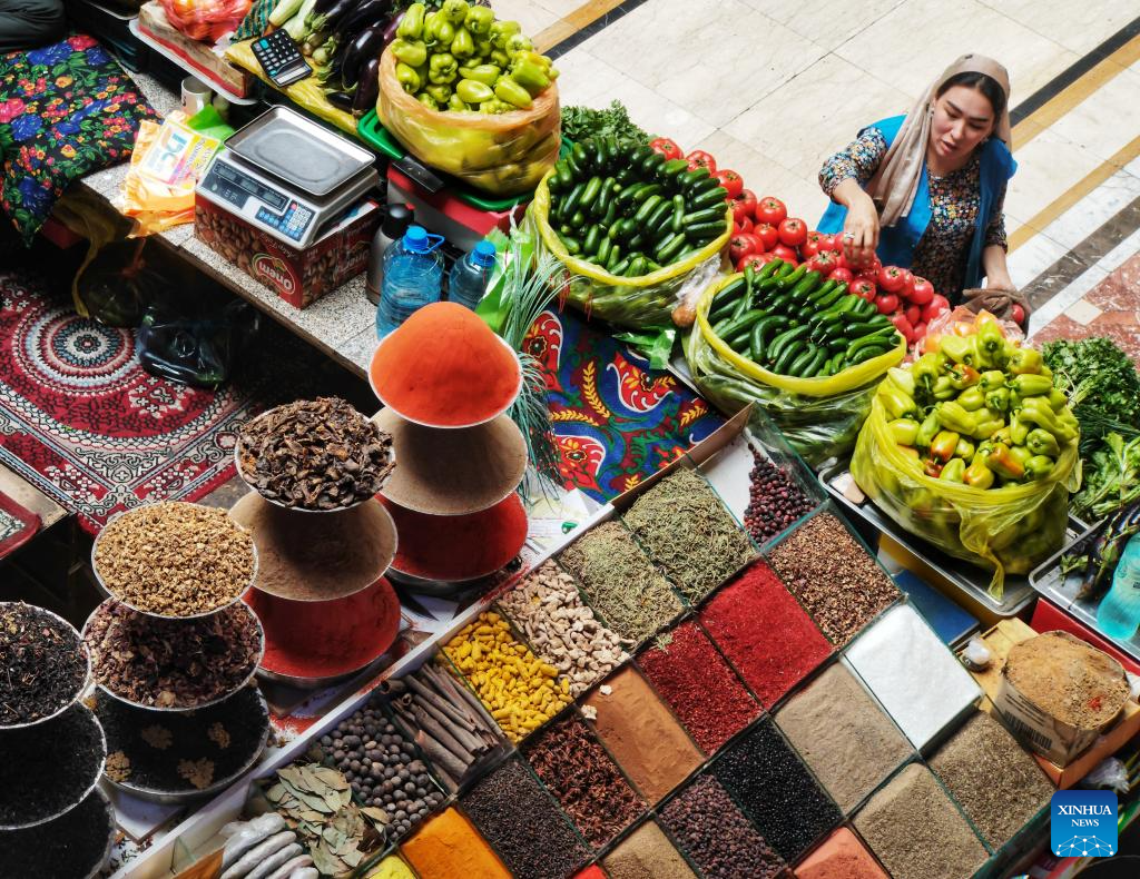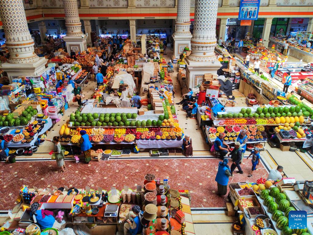 DUSAMBE, 4 julio, 2024 (Xinhua) -- Imagen del 27 de junio de 2024 del interior de un gran bazar, en Dusambé, Tayikistán. El gran bazar es una cautivadora atracción comercial en Dusambé, con una arquitectura distintiva y una maravillosa variedad de productos. (Xinhua/Cao Yang)