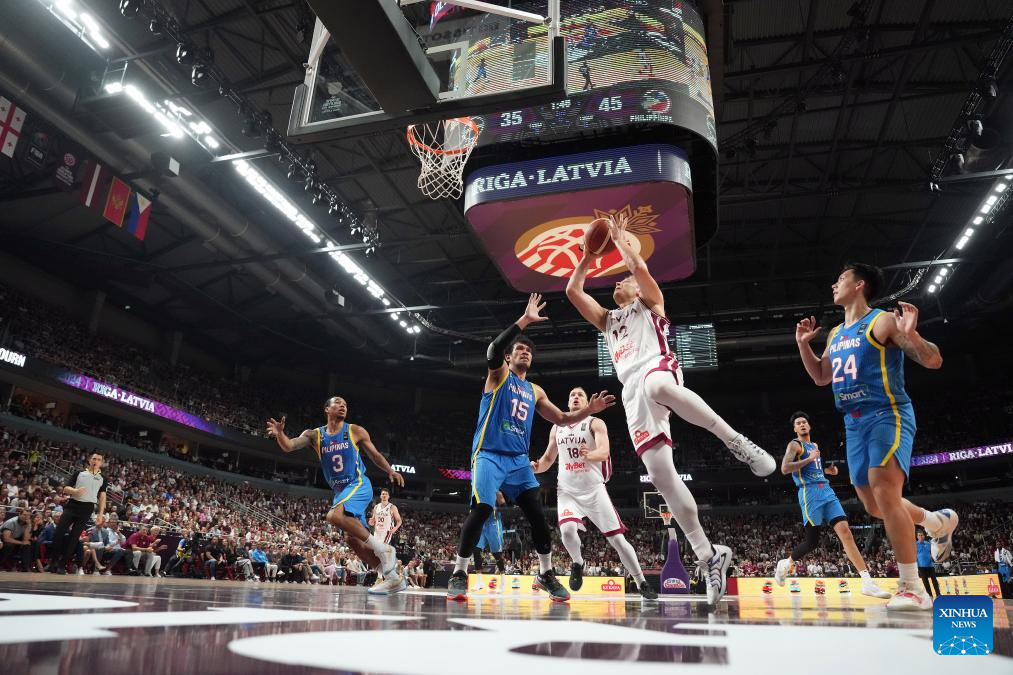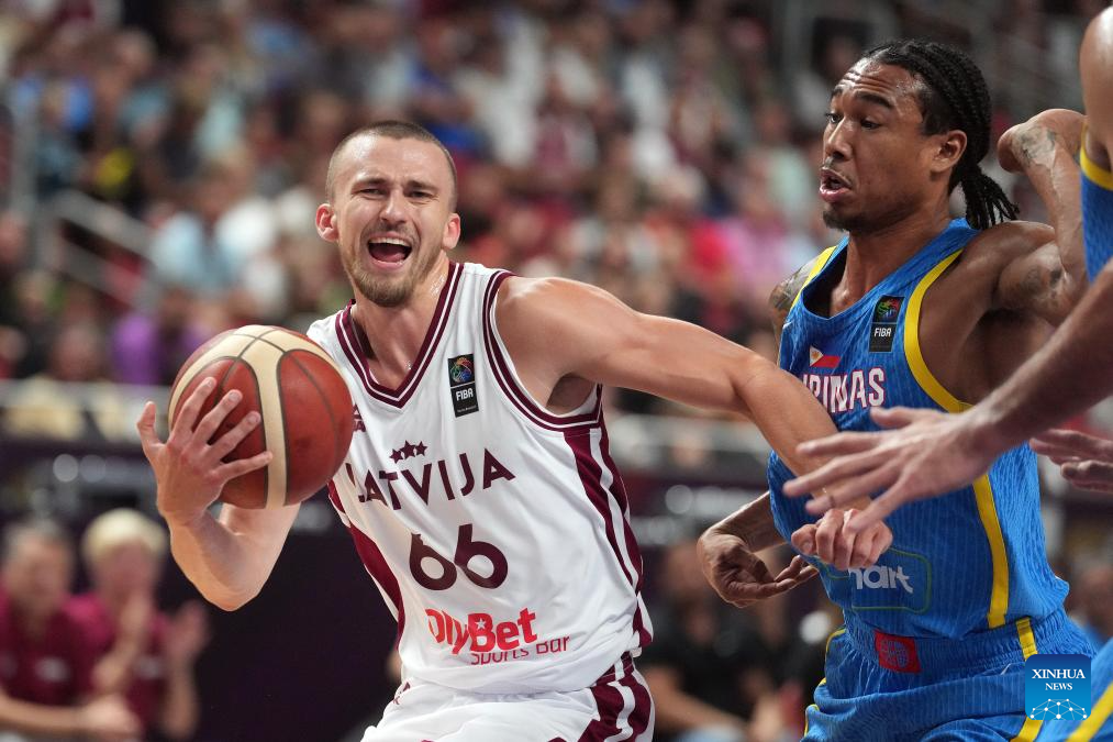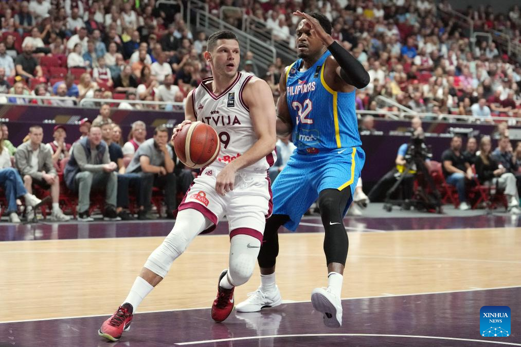 RIGA, 4 julio, 2024 (Xinhua) -- Imagen del 3 de julio de 2024 de Arturs Strautins (3-d), de Letonia, intentando anotar durante el partido correspondiente al Grupo A del Torneo Masculino de Clasificación Olímpica FIBA 2024, entre Letonia y Filipinas, en Riga, Letonia. (Xinhua/Edijs Palens)