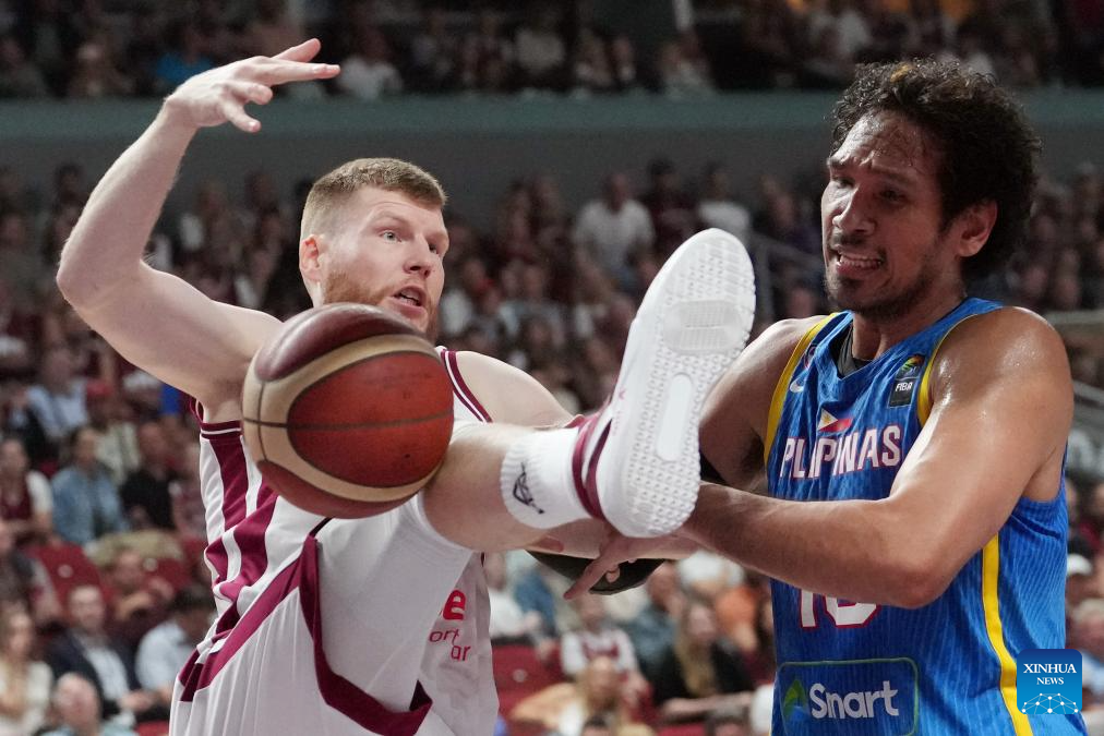 RIGA, 4 julio, 2024 (Xinhua) -- Imagen del 3 de julio de 2024 de Kristers Zoriks (i), de Letonia, disputando el balón con Chris Newsone, de Filipinas, durante el partido correspondiente al Grupo A del Torneo Masculino de Clasificación Olímpica FIBA 2024, entre Letonia y Filipinas, en Riga, Letonia. (Xinhua/Edijs Palens)