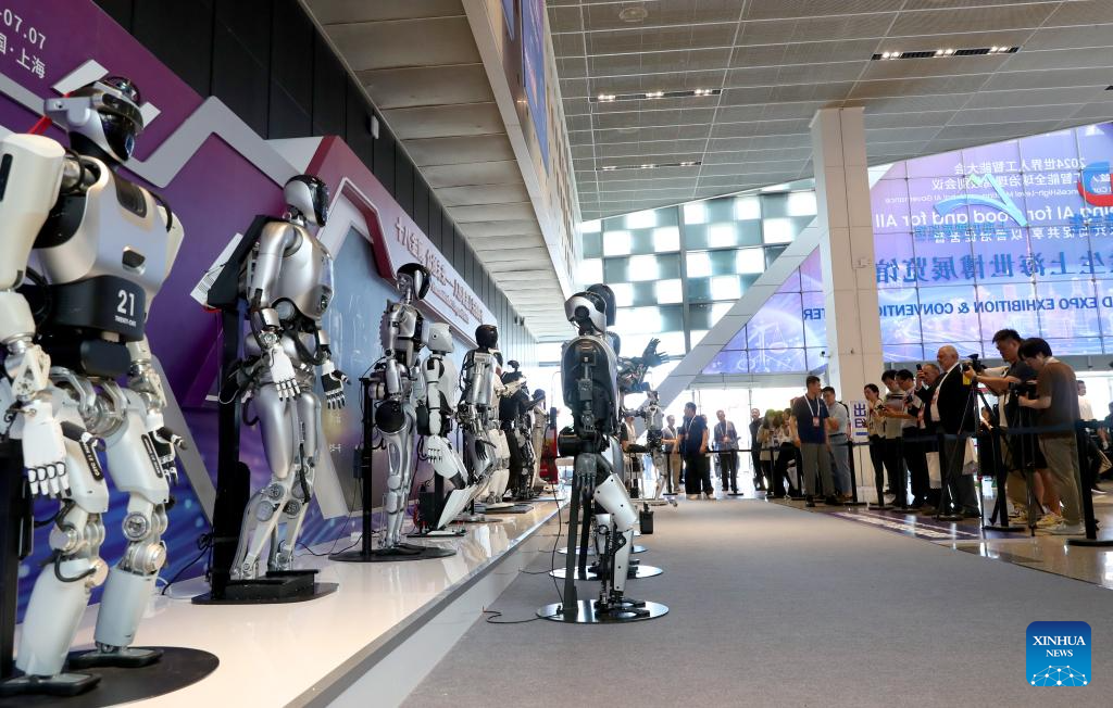 SHANGHAI, 4 julio, 2024 (Xinhua) -- Robots humanoides son exhibidos durante la Conferencia Mundial de IA de 2024, en Shanghai, en el este de China, el 4 de julio de 2024. La Conferencia Mundial de IA y la Reunión de alto nivel sobre la gobernanza mundial de la IA de 2024 se inauguraron aquí el jueves. La Conferencia Mundial de IA de este año se centra en el tema "Gobernar la IA para el bien y para todos" con el objetivo establecer plataformas internacionales de cooperación e intercambio que ofrezcan apertura, inclusión y participación igualitaria, avanzar en la gobernanza global de la IA y desarrollar un mecanismo de gobernanza abierto, justo y efectivo. La conferencia reúne a funcionarios gubernamentales y representantes de organizaciones, industrias, universidades e institutos de investigación internacionales, entre otros. (Xinhua/Fang Zhe)