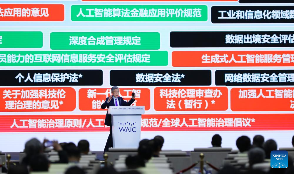 SHANGHAI, 4 julio, 2024 (Xinhua) -- Xue Lan, decano del Colegio Schwarzman en la Universidad Tsinghua, habla durante una reunión plenaria después de la ceremonia de apertura de la Conferencia Mundial de IA y la Reunión de alto nivel sobre la gobernanza mundial de la IA de 2024, en Shanghai, en el este de China, el 4 de julio de 2024. La Conferencia Mundial de IA y la Reunión de alto nivel sobre la gobernanza mundial de la IA de 2024 se inauguraron aquí el jueves. La Conferencia Mundial de IA de este año se centra en el tema "Gobernar la IA para el bien y para todos" con el objetivo establecer plataformas internacionales de cooperación e intercambio que ofrezcan apertura, inclusión y participación igualitaria, avanzar en la gobernanza global de la IA y desarrollar un mecanismo de gobernanza abierto, justo y efectivo. La conferencia reúne a funcionarios gubernamentales y representantes de organizaciones, industrias, universidades e institutos de investigación internacionales, entre otros. (Xinhua/Fang Zhe)