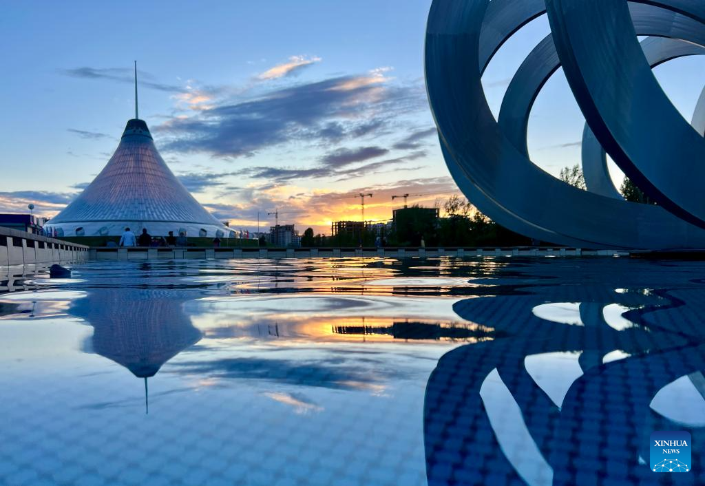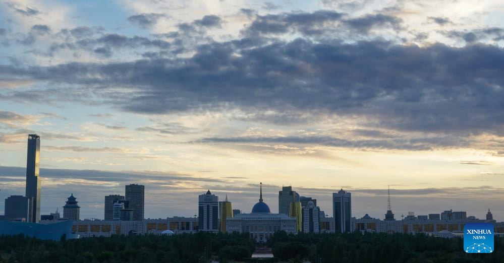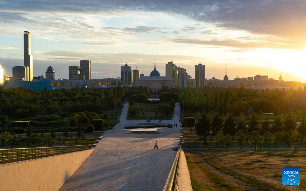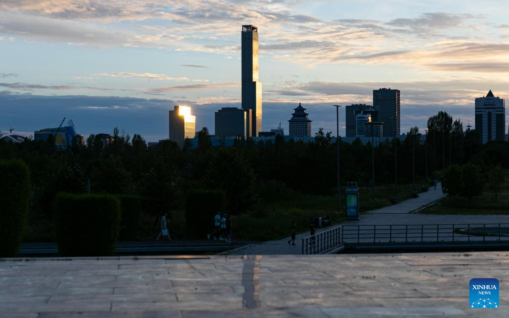 ASTANA, 4 julio, 2024 (Xinhua) -- Imagen del 2 de julio de 2024 de una vista del horizonte de la ciudad al atardecer, en Astaná, Kazajistán. (Xinhua/Wang Jianhua)