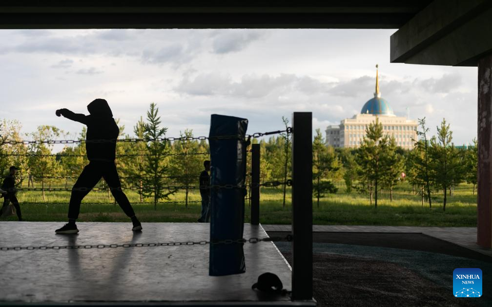 ASTANA, 4 julio, 2024 (Xinhua) -- Imagen del 2 de julio de 2024 de un hombre practicando boxeo en un patio de juegos, en Astaná, Kazajistán. (Xinhua/Bai Xueqi)