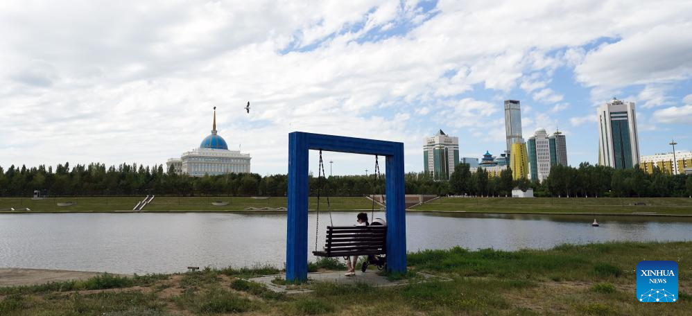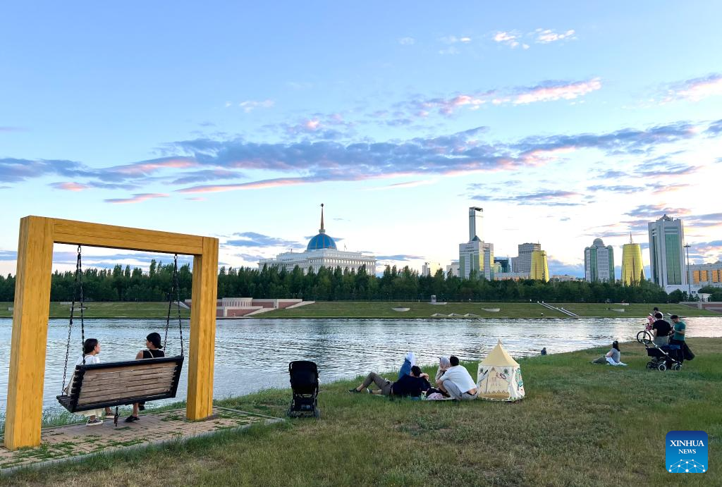 ASTANA, 4 julio, 2024 (Xinhua) -- Imagen del 29 de junio de 2024 de personas disfrutando de su tiempo libre frente al río Ishim, en Astaná, Kazajistán. (Xinhua/Pang Xinglei)