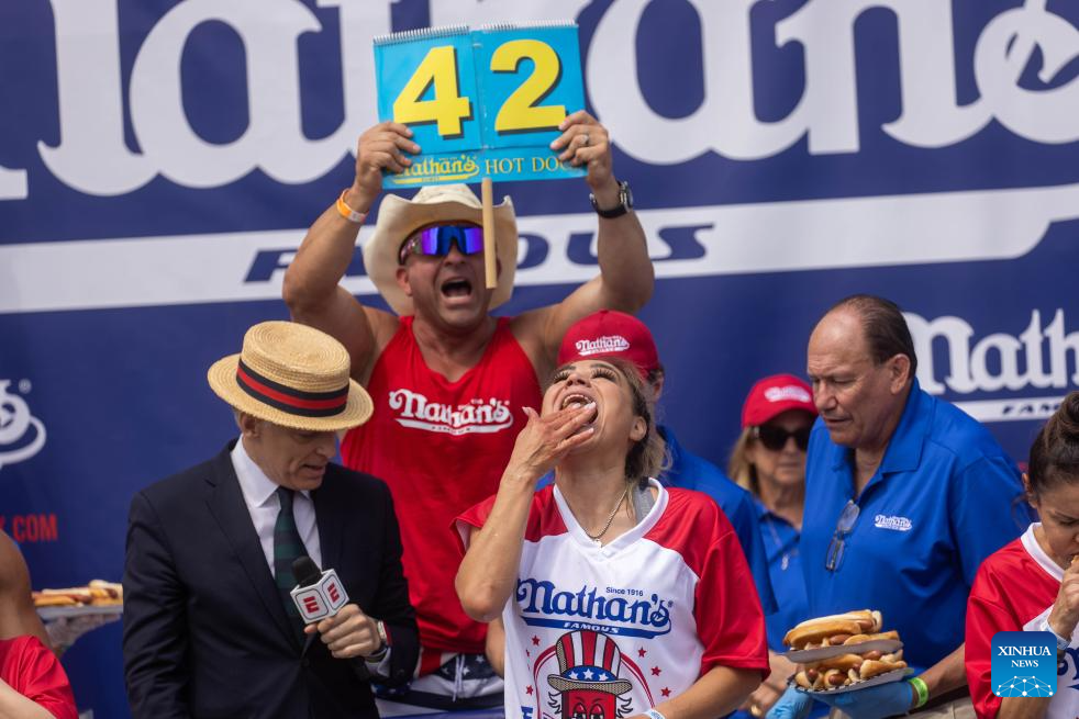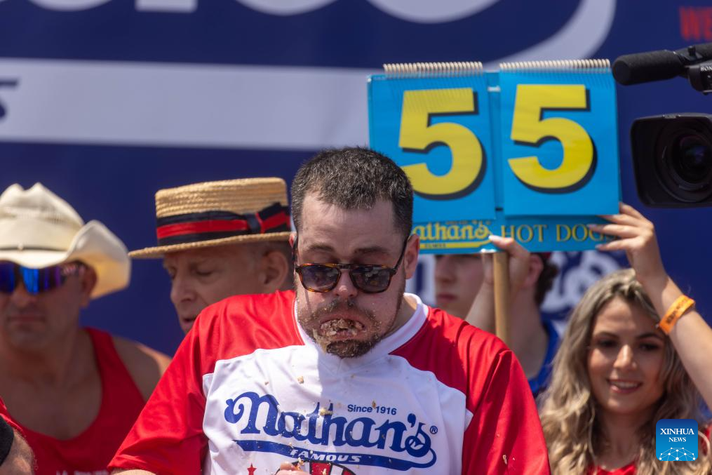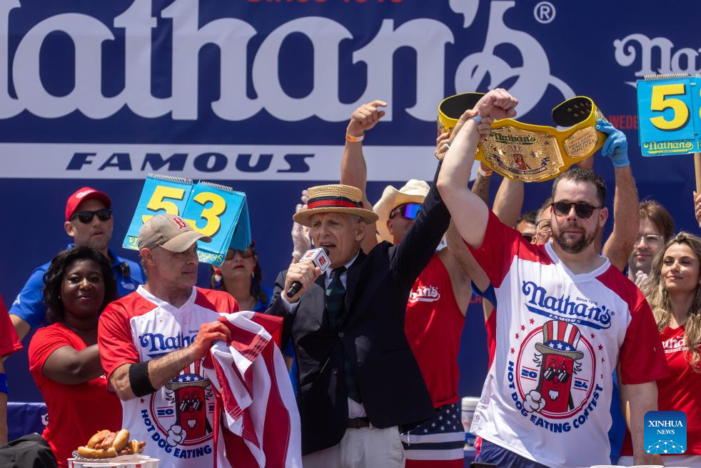 NUEVA YORK, 4 julio, 2024 (Xinhua) -- Patrick Bertoletti (d-frente) gana el Concurso de Comer Perros Calientes de Nathan's 2024, en Coney Island, Nueva York, Estados Unidos, el 4 de julio de 2024. El concurso anual de comer perros calientes en Coney Island de la ciudad de Nueva York, estado estadounidense de Nueva York, concluyó el jueves con un nuevo campeón en la competición masculina pero resultados menos impresionantes. (Xinhua/Michael Nagle)