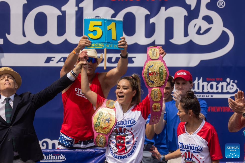 NUEVA YORK, 4 julio, 2024 (Xinhua) -- Miki Sudo (c) gana la competencia femenil durante el Concurso de Comer Perros Calientes de Nathan's 2024, en Coney Island, Nueva York, Estados Unidos, el 4 de julio de 2024. El concurso anual de comer perros calientes en Coney Island de la ciudad de Nueva York, estado estadounidense de Nueva York, concluyó el jueves con un nuevo campeón en la competición masculina pero resultados menos impresionantes. (Xinhua/Michael Nagle)