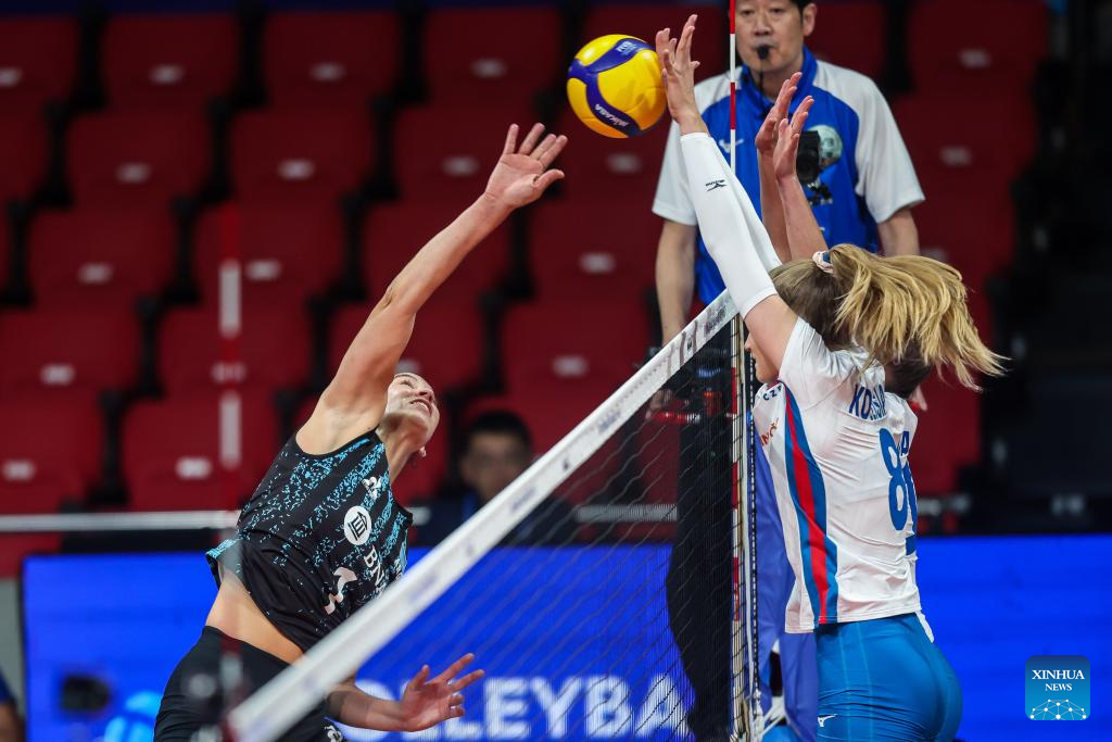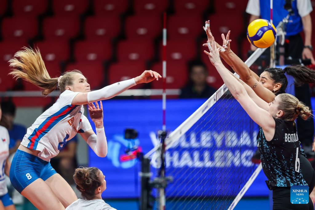 MANILA, 5 julio, 2024 (Xinhua) -- Michaela Mlejnkova (i), de República Checa, clava el balón durante el partido entre República Checa y Argentina, en la Copa Challenger de Voleibol Femenino de la FIVB 2024, en Manila, Filipinas, el 5 de julio de 2024. (Xinhua/Rouelle Umali)