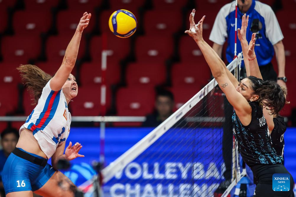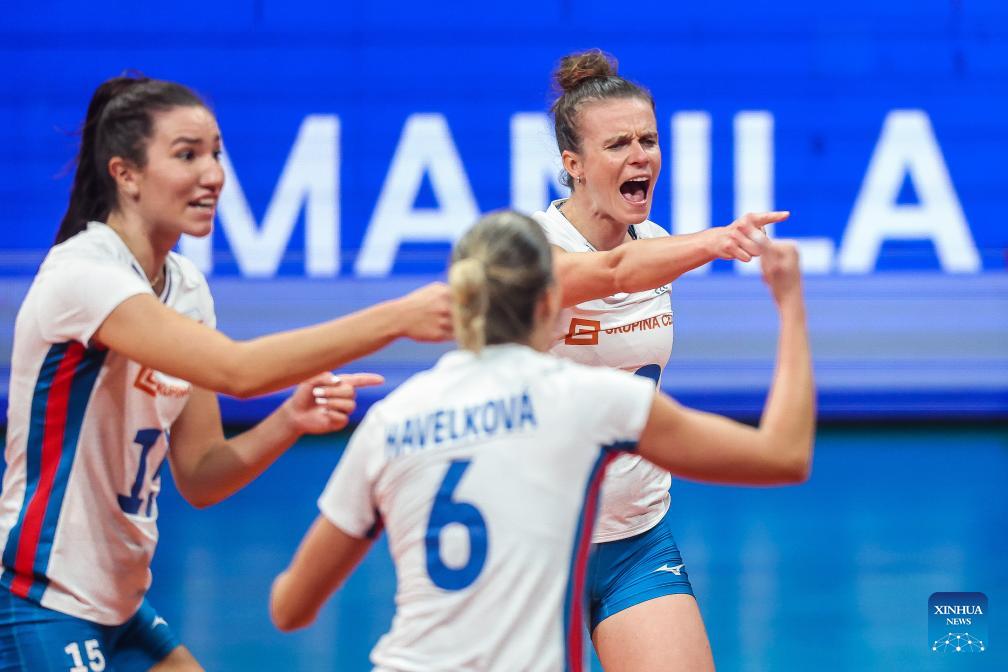 MANILA, 5 julio, 2024 (Xinhua) -- Jugadoras de República Checa festejan una anotación durante el partido entre República Checa y Argentina, en la Copa Challenger de Voleibol Femenino de la FIVB 2024, en Manila, Filipinas, el 5 de julio de 2024. (Xinhua/Rouelle Umali)