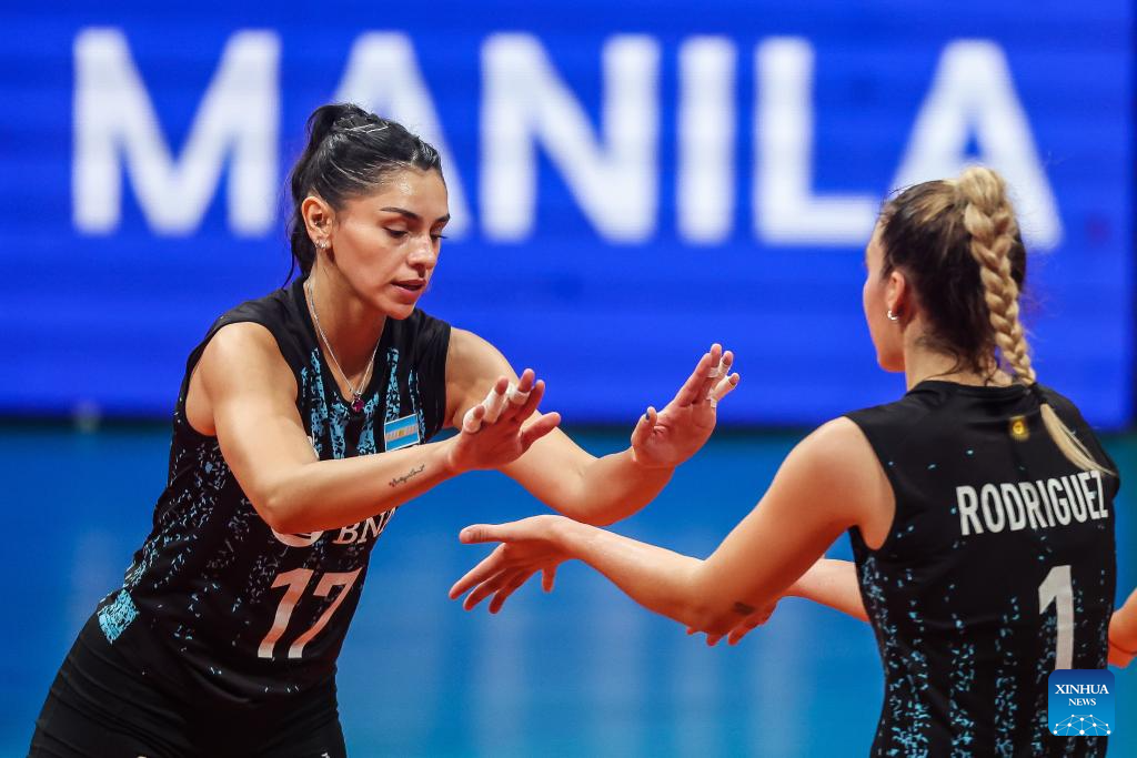 MANILA, 5 julio, 2024 (Xinhua) -- Elina María Rodríguez (i), de Argentina, clava el balón durante el partido entre República Checa y Argentina, en la Copa Challenger de Voleibol Femenino de la FIVB 2024, en Manila, Filipinas, el 5 de julio de 2024. (Xinhua/Rouelle Umali)