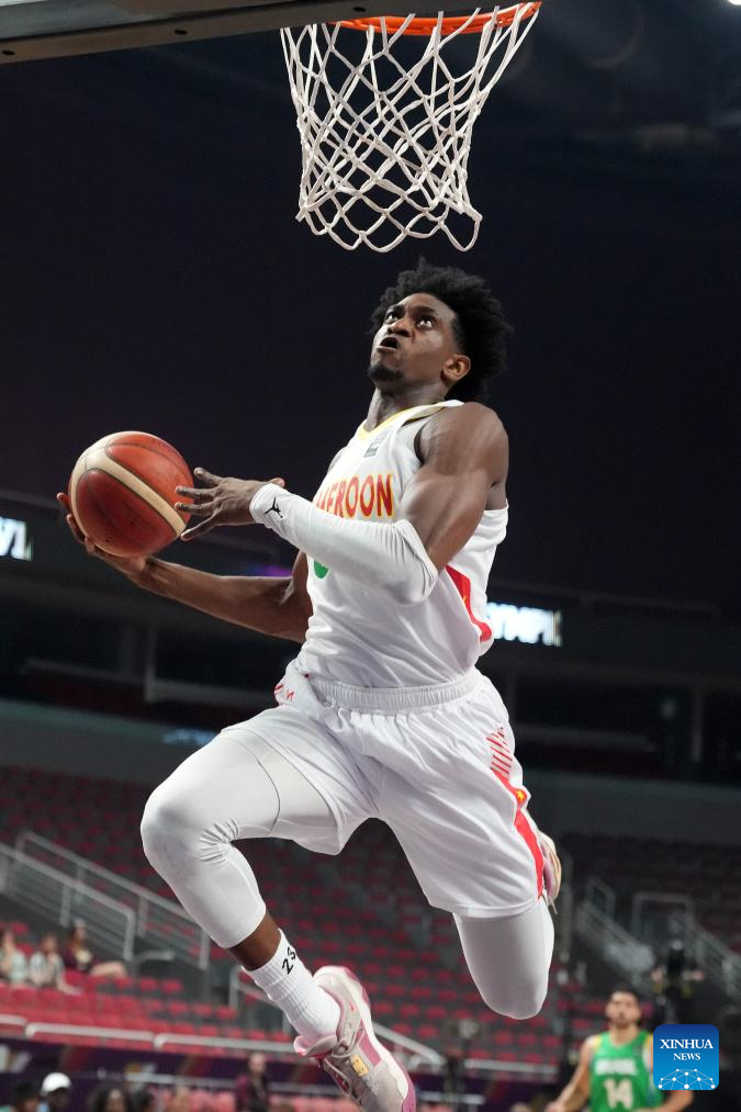 RIGA, 5 julio, 2024 (Xinhua) -- Imagen del 4 de julio de 2024 de Paul Eboua, de Camerún, intentando realizar una anotación durante el partido correspondiente al Grupo B del Torneo Masculino de Clasificación Olímpica FIBA 2024, entre Camerún y Brasil, en Riga, Letonia. (Xinhua/Edijs Palens)