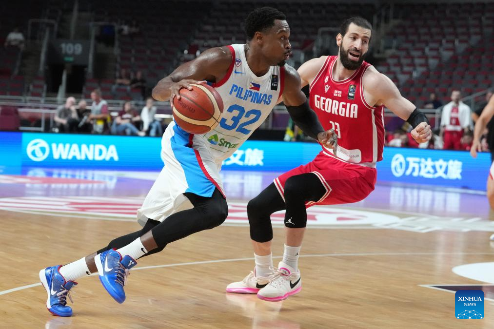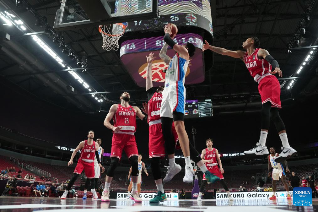 RIGA, 5 julio, 2024 (Xinhua) -- Imagen del 4 de julio de 2024 de Kai Sotto (2-d), de Filipinas, abriéndose paso durante el partido correspondiente al Grupo A del Torneo Masculino de Clasificación Olímpica FIBA 2024, entre Filipinas y Georgia, en Riga, Letonia. (Xinhua/Edijs Palens)