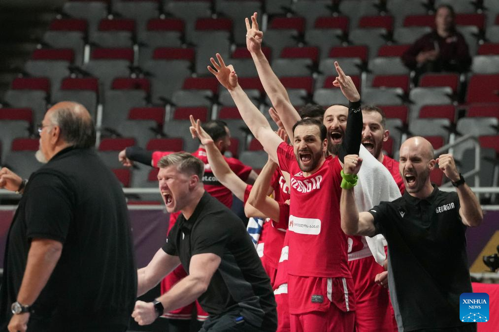 RIGA, 5 julio, 2024 (Xinhua) -- Imagen del 4 de julio de 2024 de jugadores de Georgia festejando una anotación durante el partido correspondiente al Grupo A del Torneo Masculino de Clasificación Olímpica FIBA 2024, entre Filipinas y Georgia, en Riga, Letonia. (Xinhua/Edijs Palens)
