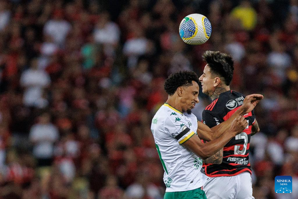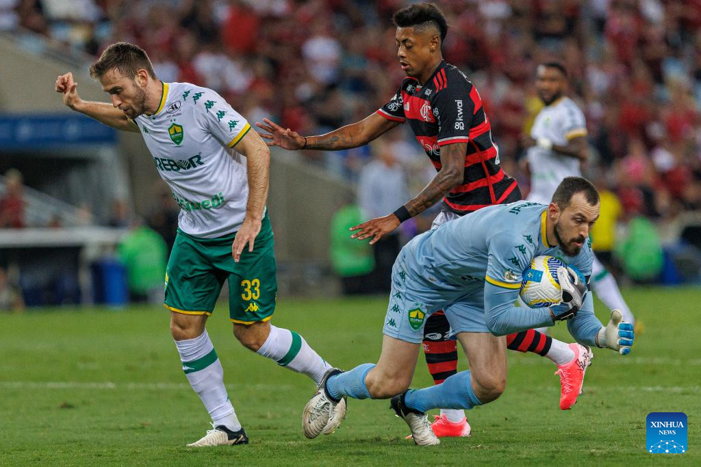 RÍO DE JANEIRO, 7 julio, 2024 (Xinhua) -- Imagen del 6 de julio de 2024 del guardameta Walter (d-frente), de Cuiabá, atajando el balón durante el partido correspondiente a la jornada 15 del Campeonato Brasileño Serie A, ante Flamengo, celebrado en el Estadio Maracaná, en Río de Janeiro, Brasil. (Xinhua/Claudia Martini)