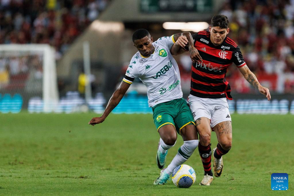 RÍO DE JANEIRO, 7 julio, 2024 (Xinhua) -- Imagen del 6 de julio de 2024 del jugador Ayrton Lucas (d), de Flamengo, disputando el balón con Jonathan Cafú (i), de Cuiabá, durante el partido correspondiente a la jornada 15 del Campeonato Brasileño Serie A, celebrado en el Estadio Maracaná, en Río de Janeiro, Brasil. (Xinhua/Claudia Martini)
