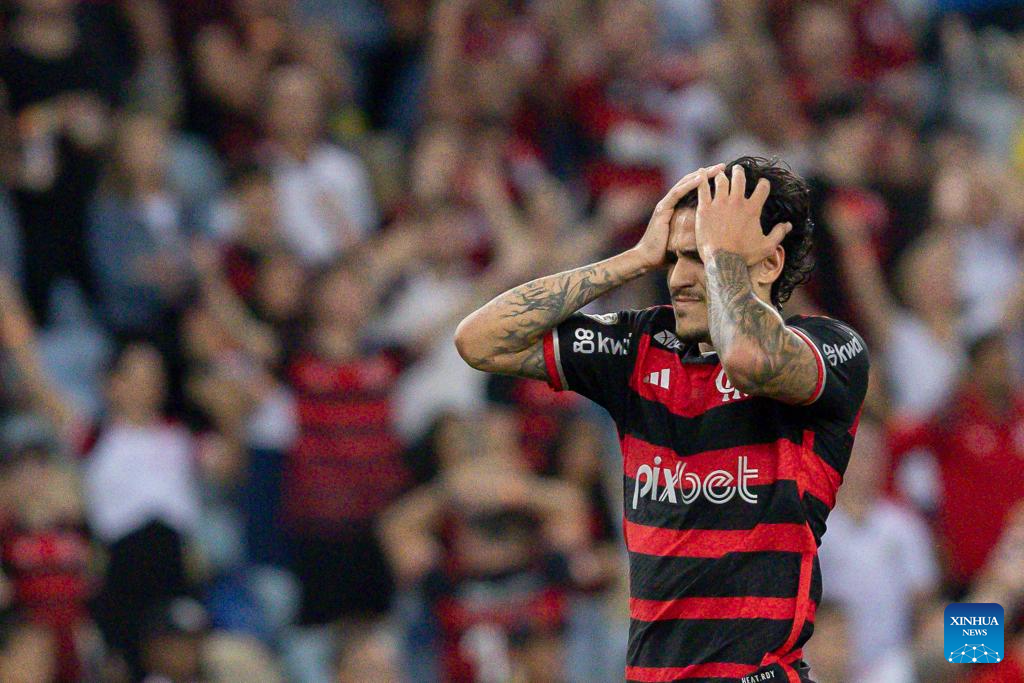 RÍO DE JANEIRO, 7 julio, 2024 (Xinhua) -- Imagen del 6 de julio de 2024 del jugador Pedro, de Flamengo, reaccionando durante el partido correspondiente a la jornada 15 del Campeonato Brasileño Serie A, ante Cuiabá, celebrado en el Estadio Maracaná, en Río de Janeiro, Brasil. (Xinhua/Claudia Martini)