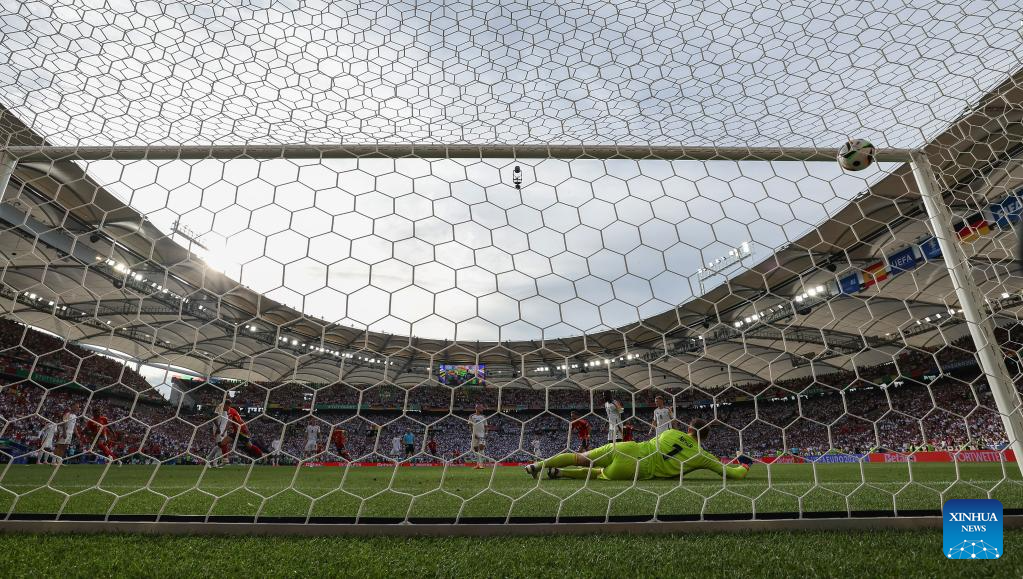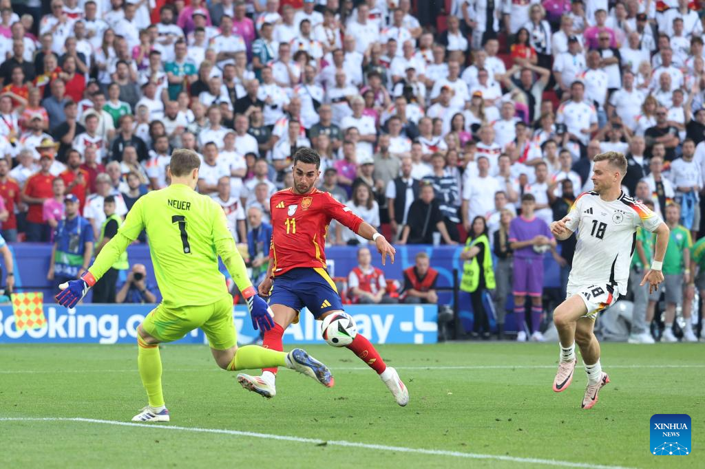 STUTTGART, 6 julio, 2024 (Xinhua) -- Imagen del 5 de julio de 2024 de Daniel Olmo (5-i), de España, anotando durante el partido correspondiente a los cuartos de final de la EURO 2024 de la UEFA, entre España y Alemania, en Stuttgart, Alemania. (Xinhua/Bai Xuefei)
