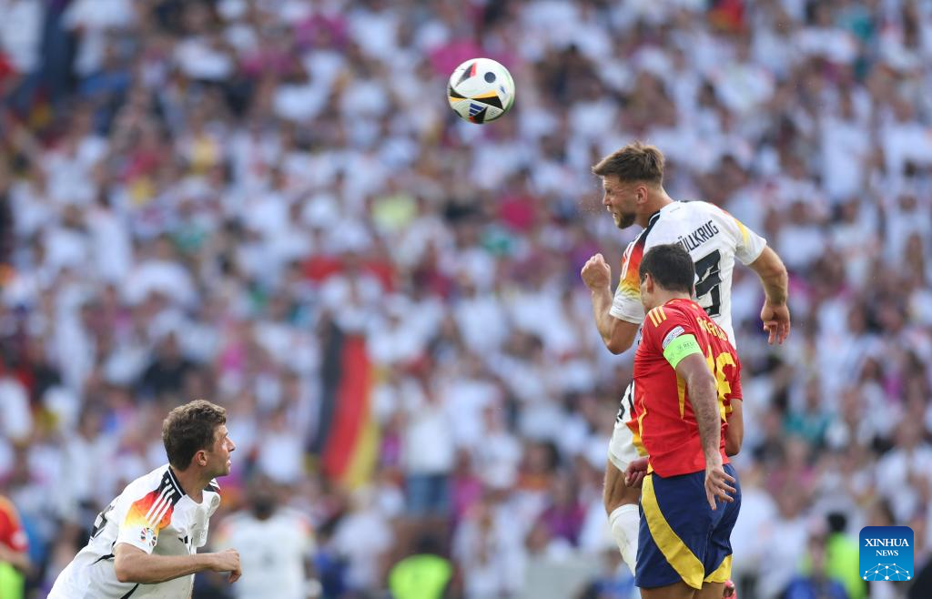 STUTTGART, 6 julio, 2024 (Xinhua) -- Imagen del 5 de julio de 2024 de Niclas Fullkrug (arriba) de Alemania, cabeceando el balón durante el partido correspondiente a los cuartos de final de la EURO 2024 de la UEFA, entre España y Alemania, en Stuttgart, Alemania. (Xinhua/Bai Xuefei)