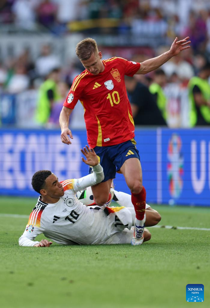STUTTGART, 6 julio, 2024 (Xinhua) -- Imagen del 5 de julio de 2024 de Daniel Olmo (arriba), de España, compitiendo con Jamal Musiala, de Alemania, durante el partido correspondiente a los cuartos de final de la EURO 2024 de la UEFA, entre España y Alemania, en Stuttgart, Alemania. (Xinhua/Bai Xuefei)