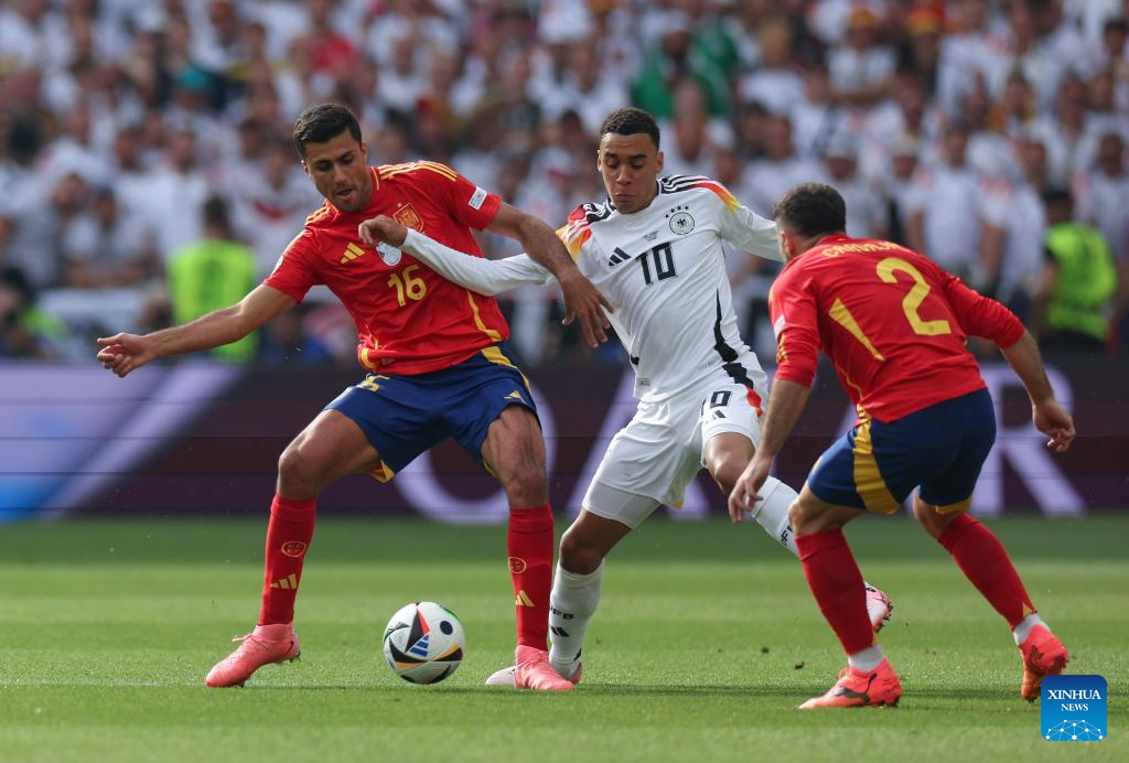 STUTTGART, 6 julio, 2024 (Xinhua) -- Imagen del 5 de julio de 2024 de Rodri (i) y Daniel Carvajal Ramos, de España, compitiendo con Jamal Musiala (c), de Alemania, durante el partido correspondiente a los cuartos de final de la EURO 2024 de la UEFA, entre España y Alemania, en Stuttgart, Alemania. (Xinhua/Bai Xuefei)