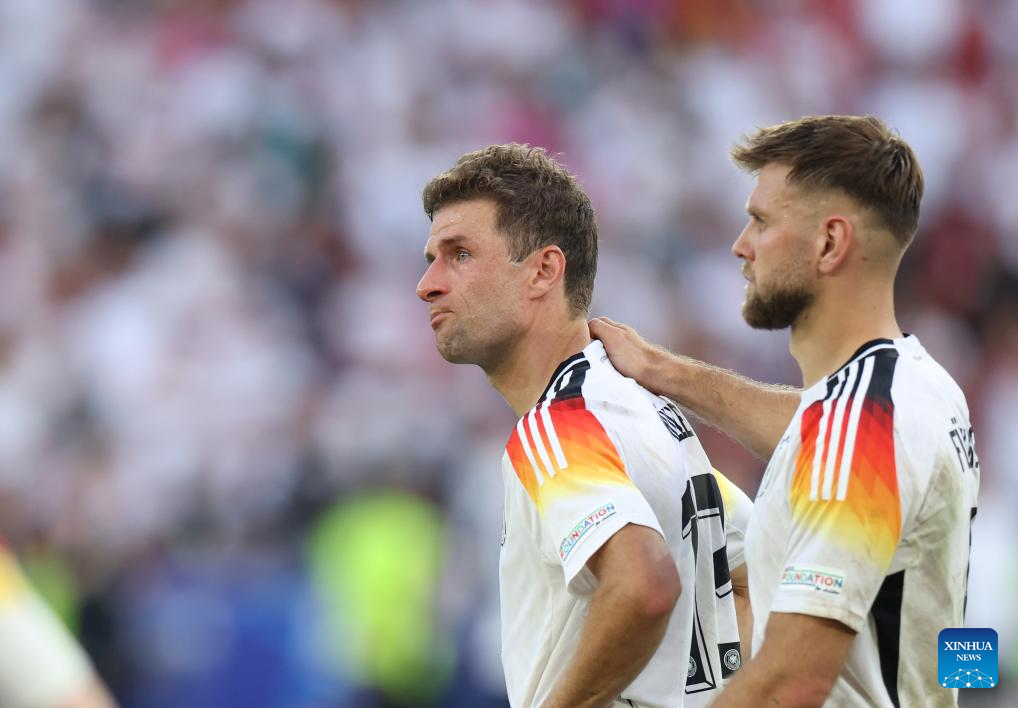 STUTTGART, 6 julio, 2024 (Xinhua) -- Imagen del 5 de julio de 2024 de Thomas Müller (i), de Alemania, reaccionando al término del partido correspondiente a los cuartos de final de la EURO 2024 de la UEFA, entre España y Alemania, en Stuttgart, Alemania. (Xinhua/Bai Xuefei)