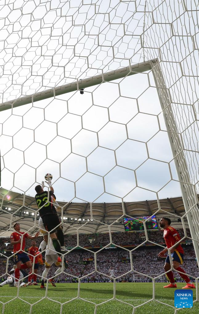 STUTTGART, 6 julio, 2024 (Xinhua) -- Imagen del 5 de julio de 2024 de guardameta Unai Simón (arriba), de España, realizando una atajada durante el partido correspondiente a los cuartos de final de la EURO 2024 de la UEFA, entre España y Alemania, en Stuttgart, Alemania. (Xinhua/Bai Xuefei)