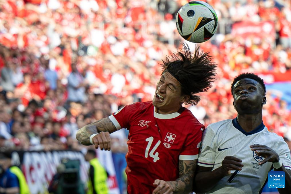 DUSSELDORF, 7 julio, 2024 (Xinhua) -- Imagen del 6 de julio de 2024 de Steven Zuber (i), de Suiza, disputando el balón con Bukayo Saka, de Inglaterra, durante el partido correspondiente a los cuartos de final de la EURO 2024 de la UEFA, entre Inglaterra y Suiza, en Dusseldorf, Alemania. (Xinhua/Xiao Yijiu)