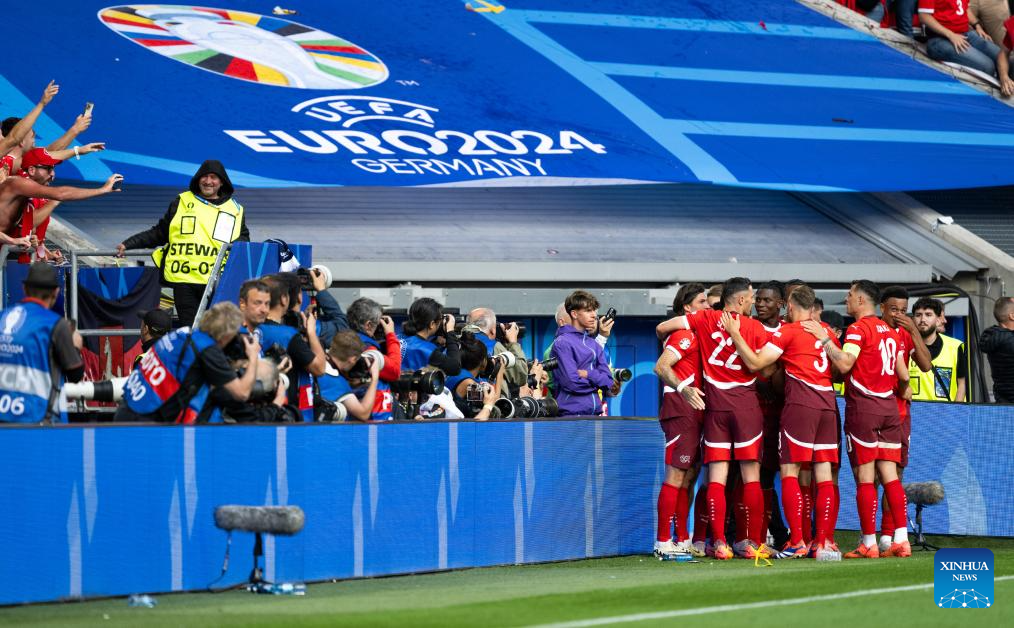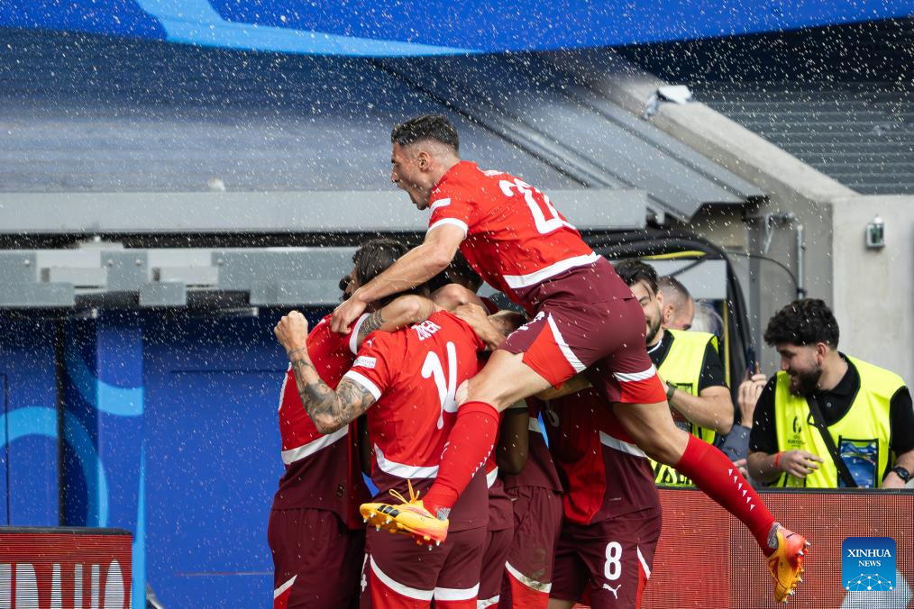 DUSSELDORF, 7 julio, 2024 (Xinhua) -- Imagen del 6 de julio de 2024 de jugadores de Suiza festejando una anotación de Breel Donald Embolo durante el partido correspondiente a los cuartos de final de la EURO 2024 de la UEFA, entre Inglaterra y Suiza, en Dusseldorf, Alemania. (Xinhua/Xiao Yijiu)