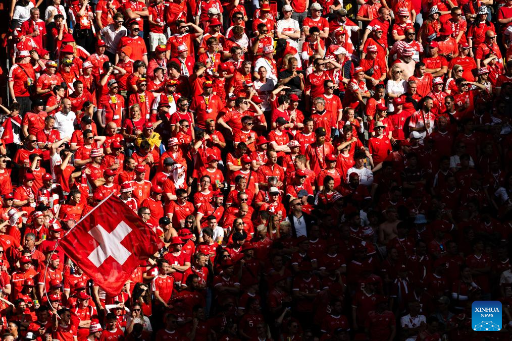 DUSSELDORF, 7 julio, 2024 (Xinhua) -- Imagen del 6 de julio de 2024 de aficionados de Suiza observando el partido correspondiente a los cuartos de final de la EURO 2024 de la UEFA, entre Inglaterra y Suiza, en Dusseldorf, Alemania. (Xinhua/Xiao Yijiu)