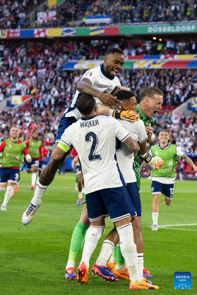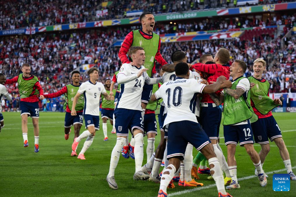 DUSSELDORF, 7 julio, 2024 (Xinhua) -- Imagen del 6 de julio de 2024 de jugadores de Inglaterra festejando después de ganar el partido correspondiente a los cuartos de final de la EURO 2024 de la UEFA, entre Inglaterra y Suiza, en Dusseldorf, Alemania. (Xinhua/Xiao Yijiu)