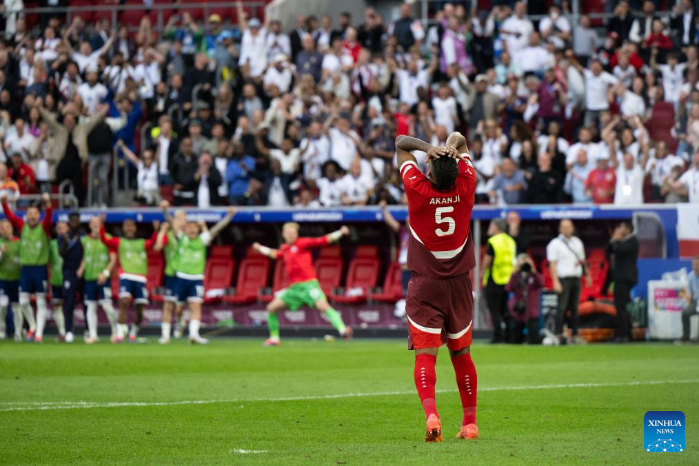 DUSSELDORF, 7 julio, 2024 (Xinhua) -- Imagen del 6 de julio de 2024 de Michel Akanji, de Suiza, reaccionando después de fallar un tiro penal en la ronda de penales durante el partido correspondiente a los cuartos de final de la EURO 2024 de la UEFA, entre Inglaterra y Suiza, en Dusseldorf, Alemania. (Xinhua/Xiao Yijiu)